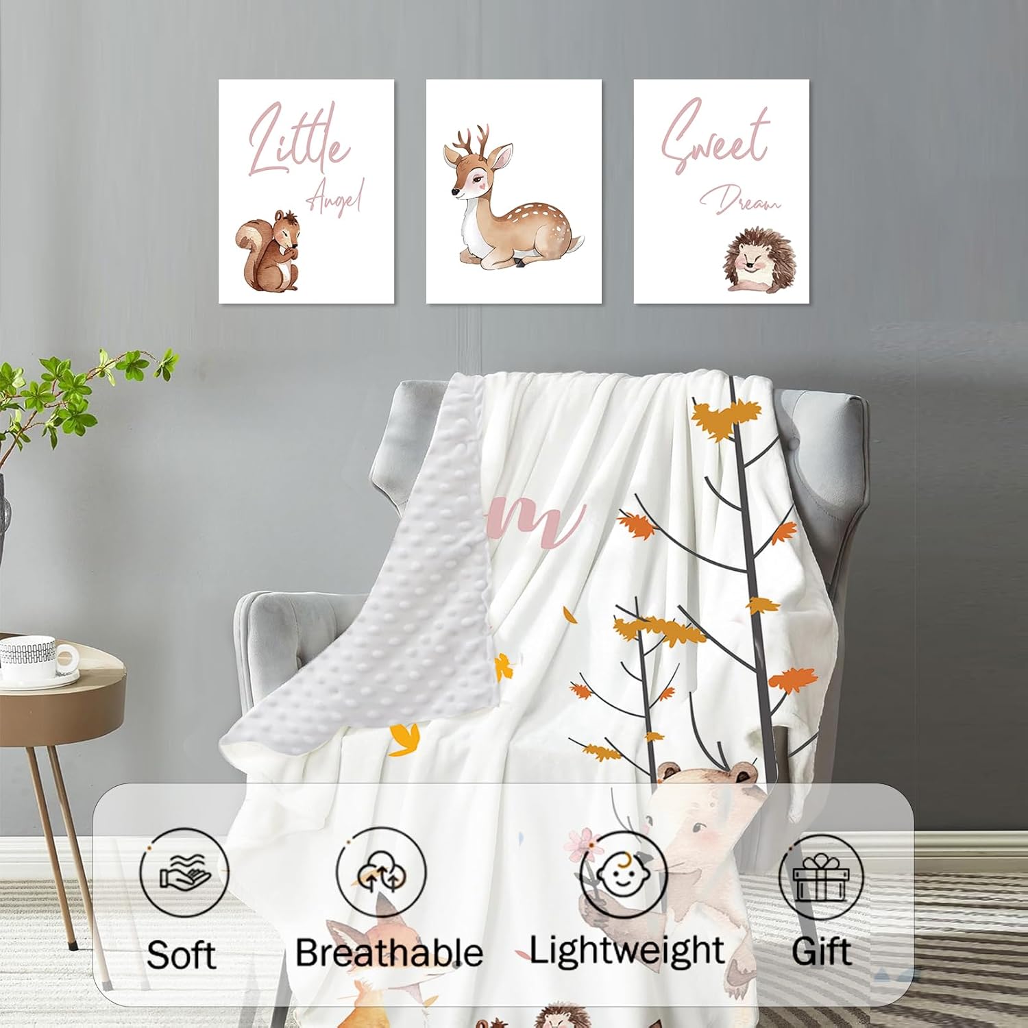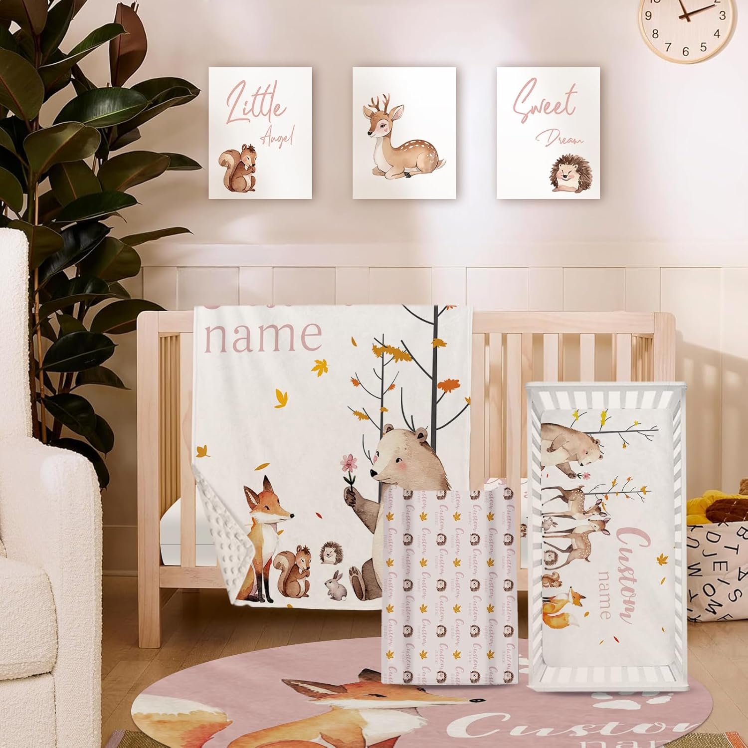 - Included Components : Changing Pad Cover, Double Layer Blanket, Fitted Sheet, Round Rug, Wall Art