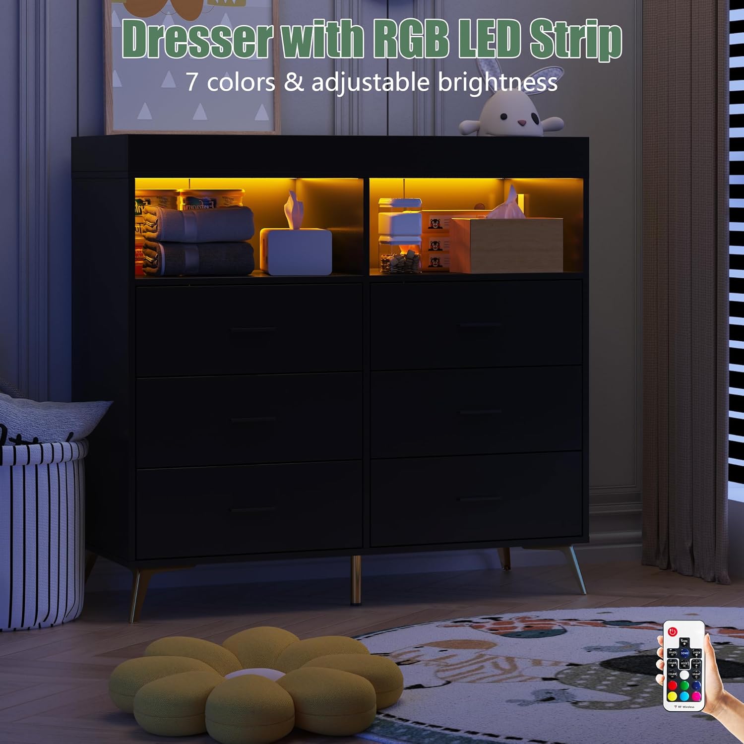 - Attractive Design: This kids dresser with LED light strip and built-in power outlet combines functionality and style. The light color and intensity are adjustable, which can set the perfect lighting mood for any scene. The metal feet design and metal pulls not only provide convenience, but also make the white dresser more attractive.