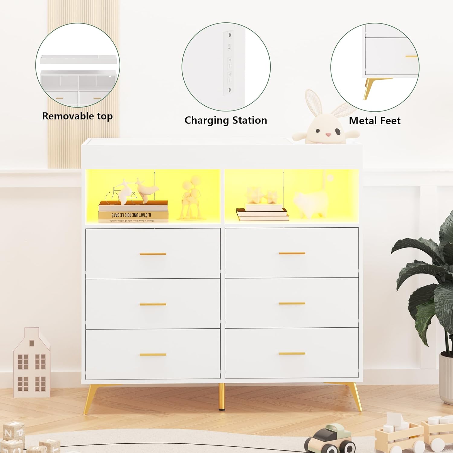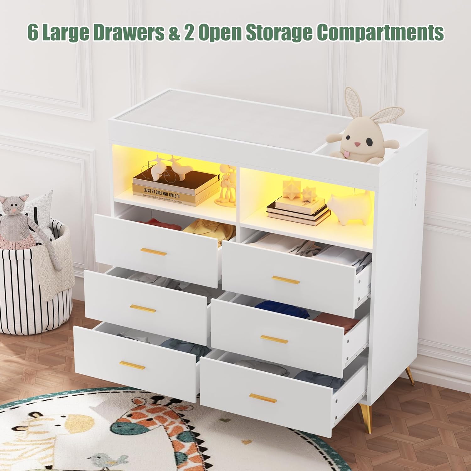 GarveeHome Dresser for Bedroom with 6 Drawers, Baby Changing Table Dresser with Changing Pad, LED Lights & Charging Station, Baby Changing Station with Changing Table Top, White
