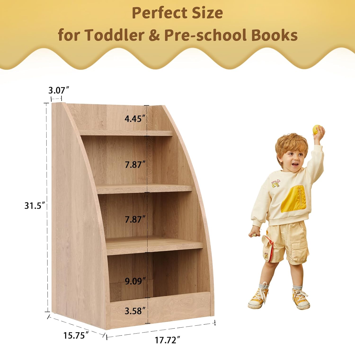 - Toddler Bookshelf: Measuring 31.5x 15.7 x 17.7 inches, this 4-tier nursery bookcase provides ample storage for books and toys, supporting up to 66 lbs. Assembly is quick and easy with the included instructions and hardware. Cleaning is a breeze—simply wipe down with a damp cloth and allow to air dry