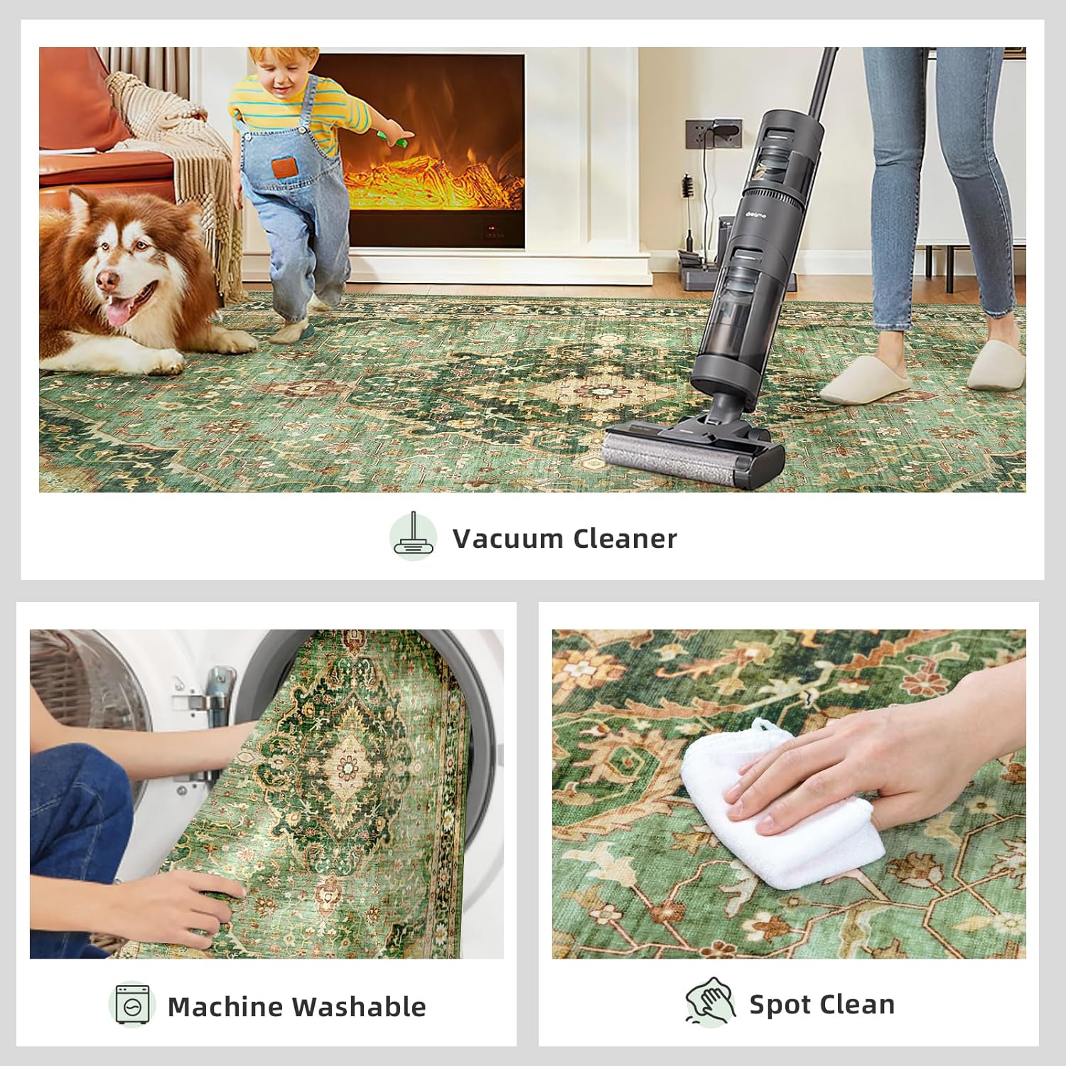 10x14 Rugs for Living Room Bedroom, Washable Green Area Rugs Non Slip Large Rug for Dining Room Office, Floor Decoration Vintage Boho Big Rug Carpet Low-Pile Kid & Pet Friendly
