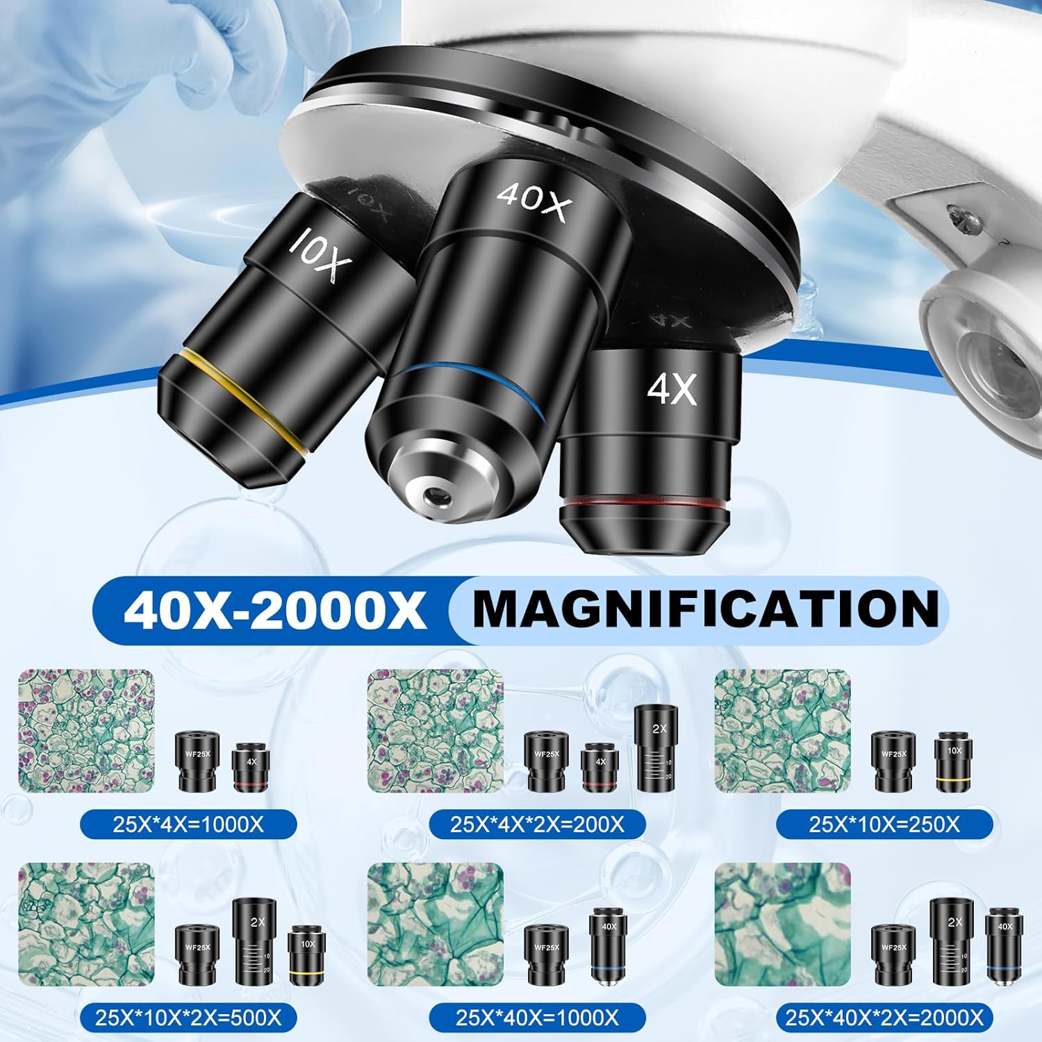 - Professional-Grade Magnification & Crystal-Clear Imaging: Engineered with WF10X/25X eyepieces and 4X/10X/40X objectives, this microscope offers various magnification levels (40X-2000X) for stunning clarity. Perfect for observing cell structures, plant cells, and insect wings, it delivers lab-certified precision for both beginners and professionals.