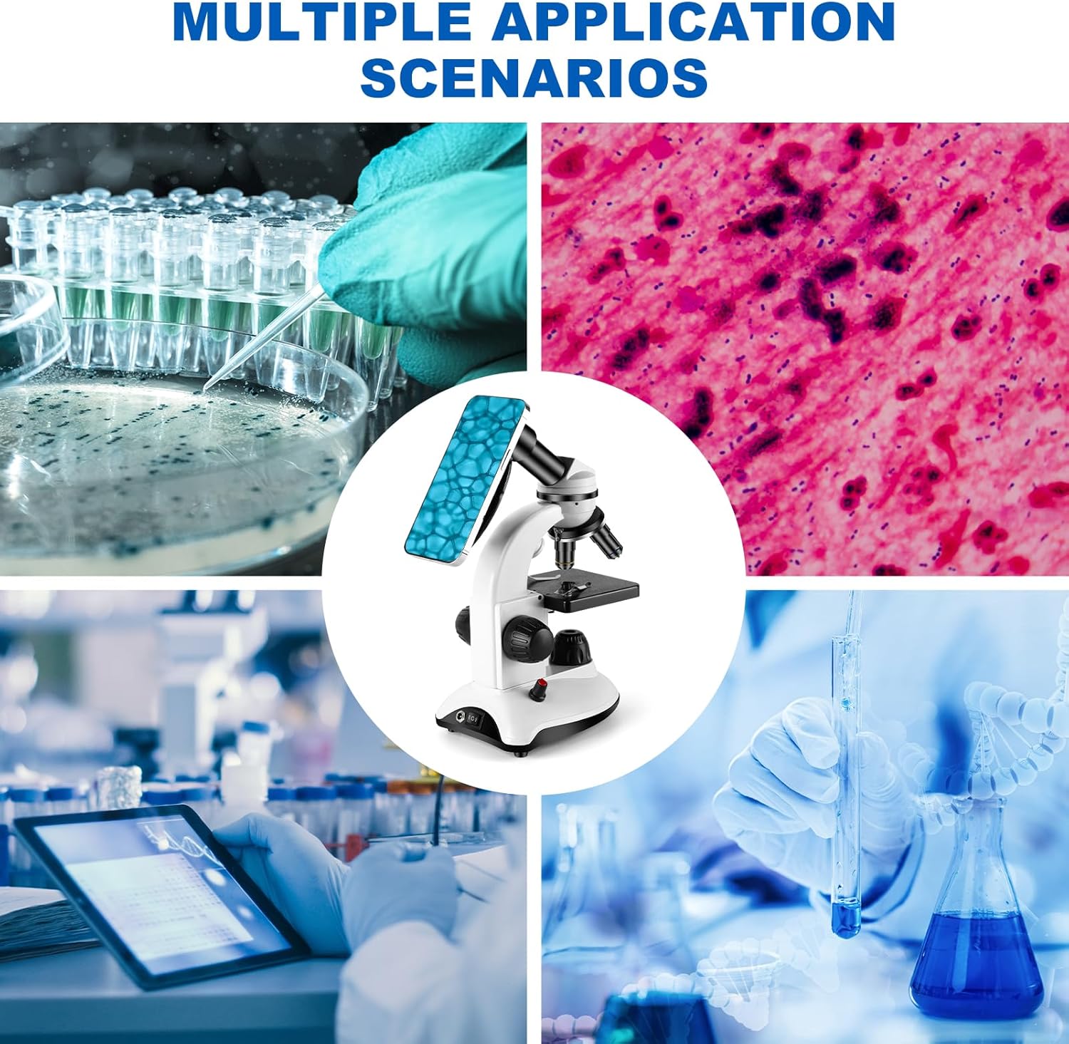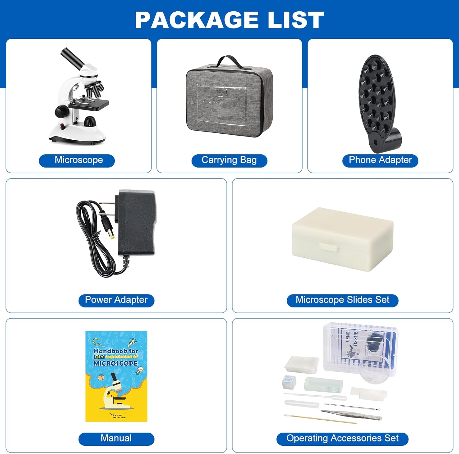 - Complete Accessories to Meet Everything You Need: Includes a variety of accessories: 10 prepared specimen slides, 100 cover slips, a phone adapter, and a shockproof carrying case. Lightweight and portable (only 3.2 lbs), it is perfect for learning on the go and meets all your microscopy needs.