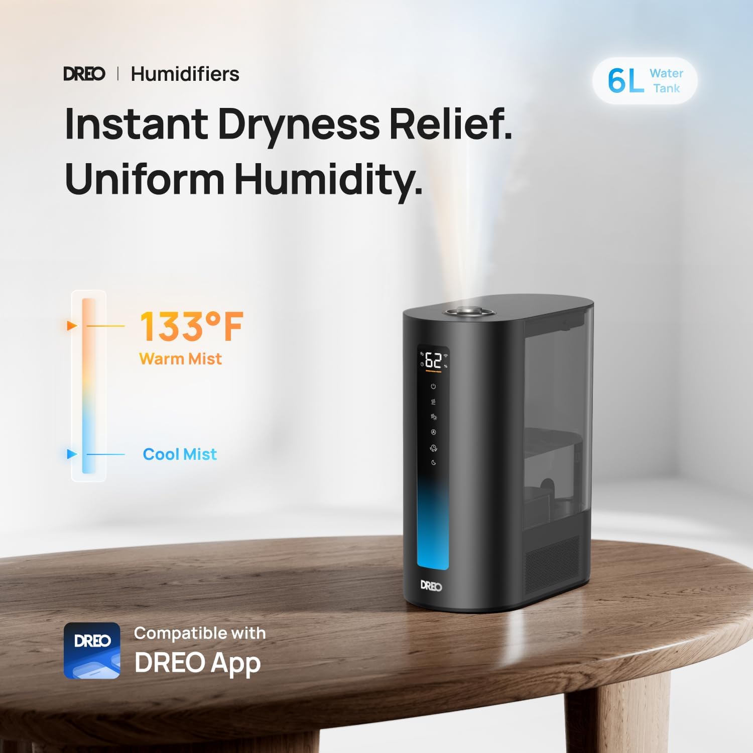 Dreo 6L Humidifiers for Bedroom, Smart Warm & Cool Mist for Large Room, 60Hr Quiet Runtime for Baby, Plant, Humidity Sensor, Indicator Light, 12H Timer, Google/Alexa, Black