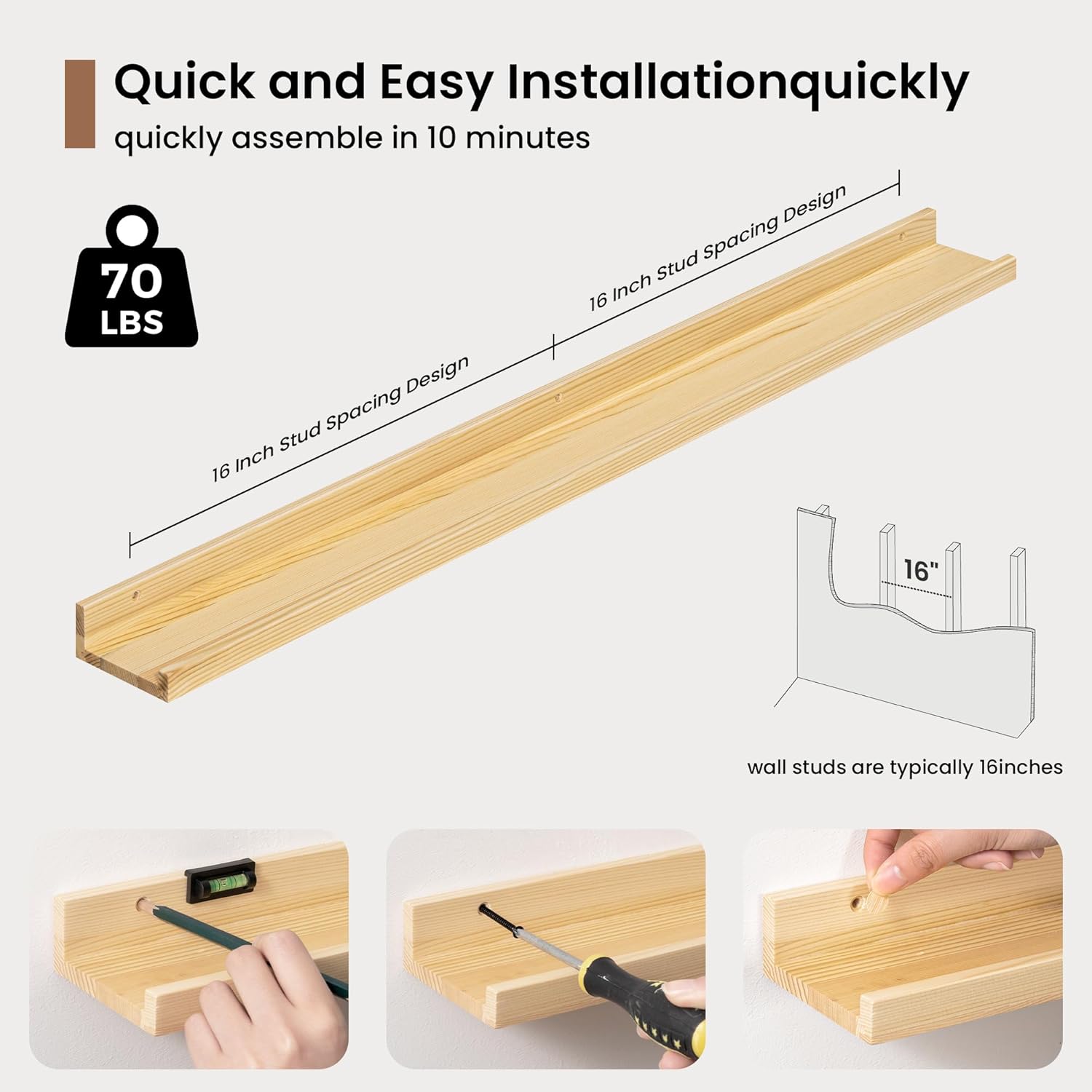 - 3.5" Floating Picture Ledge: Anti-Slip Narrow Design-3.5" ultra-narrow depth holds frames/plants without sliding, even on angled walls. Stud-Mounted Stability-16" pre-drilled holes match standard studs (hardware incl.) for wobble-free install. Clutter-Free Aesthetic-Clean lines blend with farmhouse/Scandinavian decor, focusing on your treasures