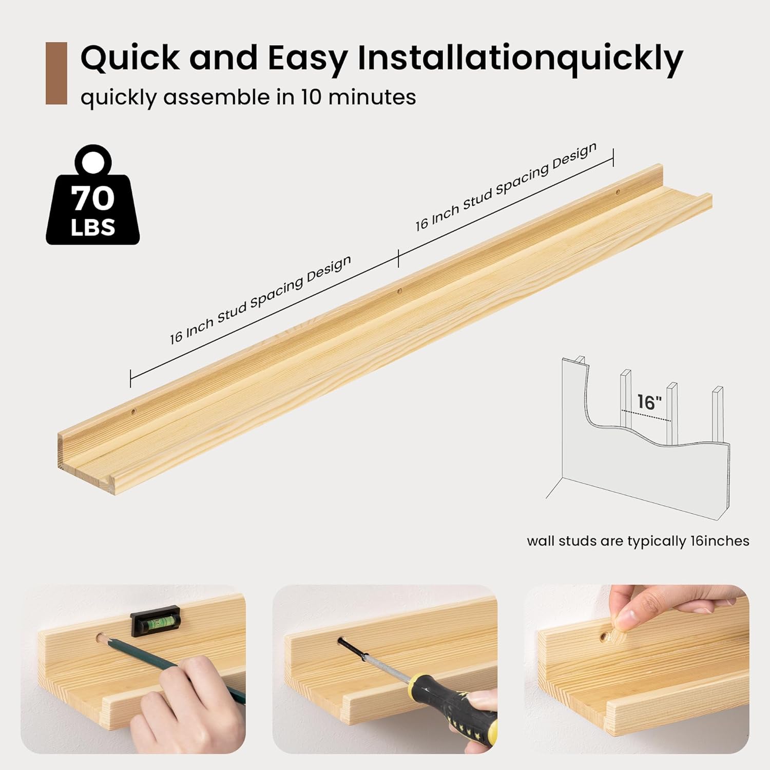 - Easy to Install: Fun Memories fully assembled solid pine wood picture ledge shelf set of 2 comes with the pre-drilled holes and necessary hardware including a mini level to make installation a breeze. The floating design creates a seamless, streamlined look, adding a touch of modern sophistication to your interior. If you have any questions about our products, please feel free to contact us