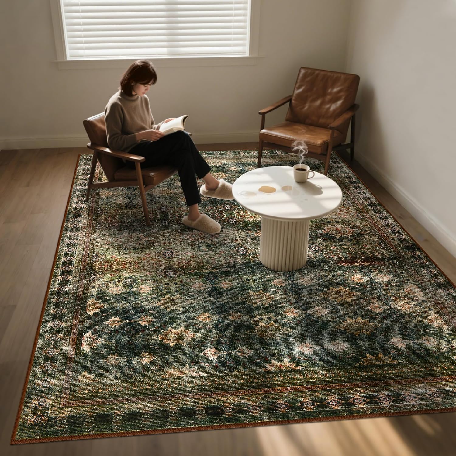 5x7 Washable Area Rug for Living Room Rustic, Non Slip Vintage Floral Bedroom Rugs Retro, Traditional Indoor Floor Carpet for Dining Room, Farmhouse, Office Classroom(Dark Green/Brown/Multi)