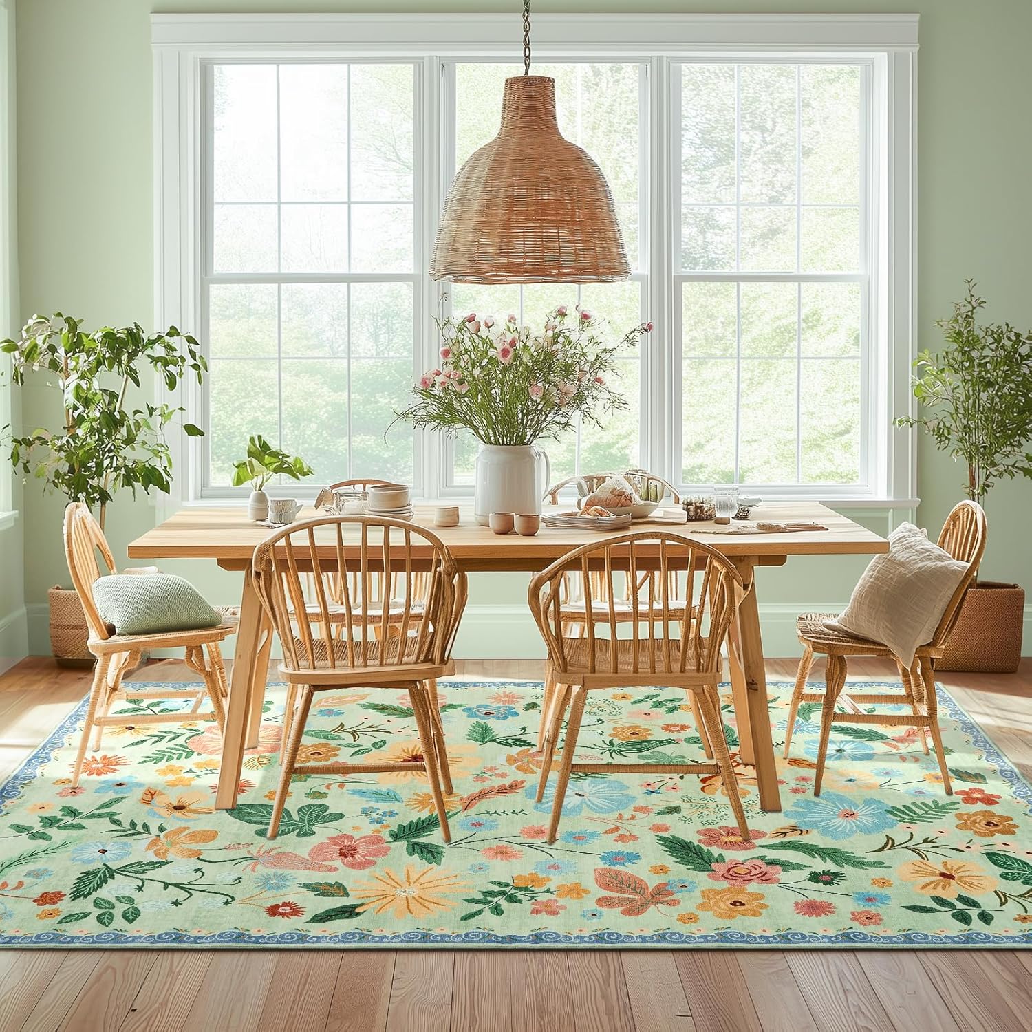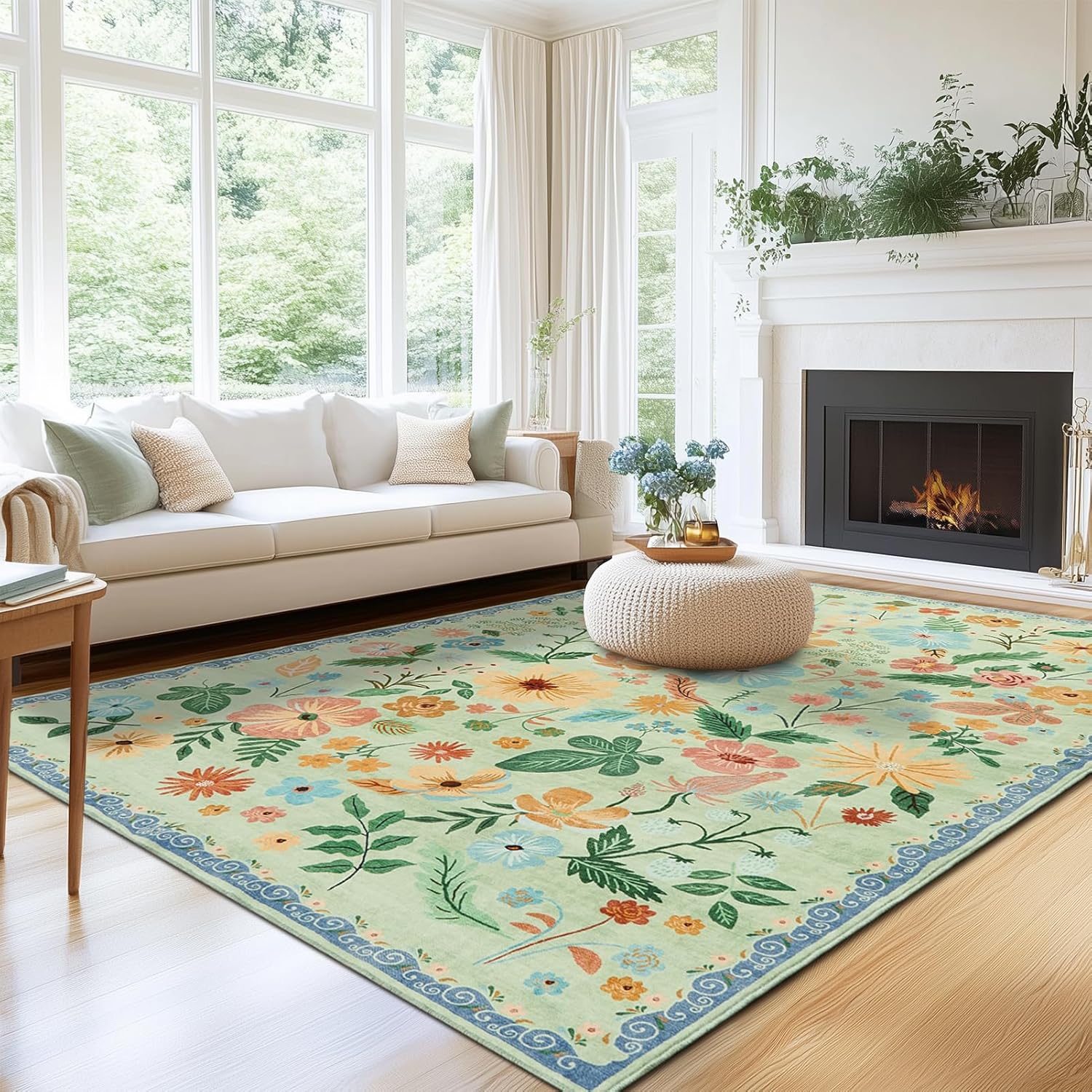 6x9 Area Rugs for Living Room Machine Washable Non Alip Ultra-Thin Spring Garden Area Carpet Soft Boho Vintage Floral Print Sage Green Accent Rugs for Bedroom Family Room Nursery Kids Playroom