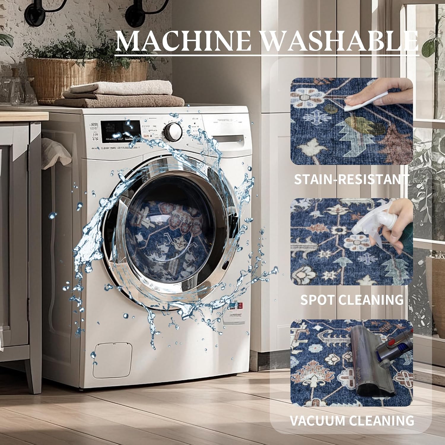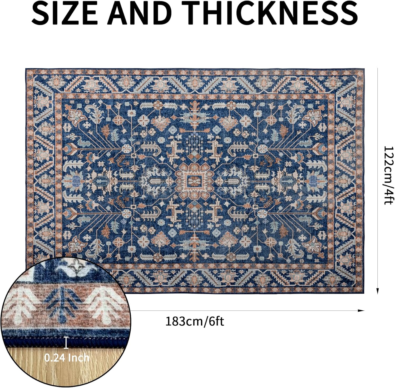 4x6 Area Rug Washable: Oriental Soft Area Rug for Living Room Bedroom No Shedding - Low Pile Thin Carpet Rug for Dining Room Non Slip - Boho Vintage Rug for Home Decor - Navy Blue