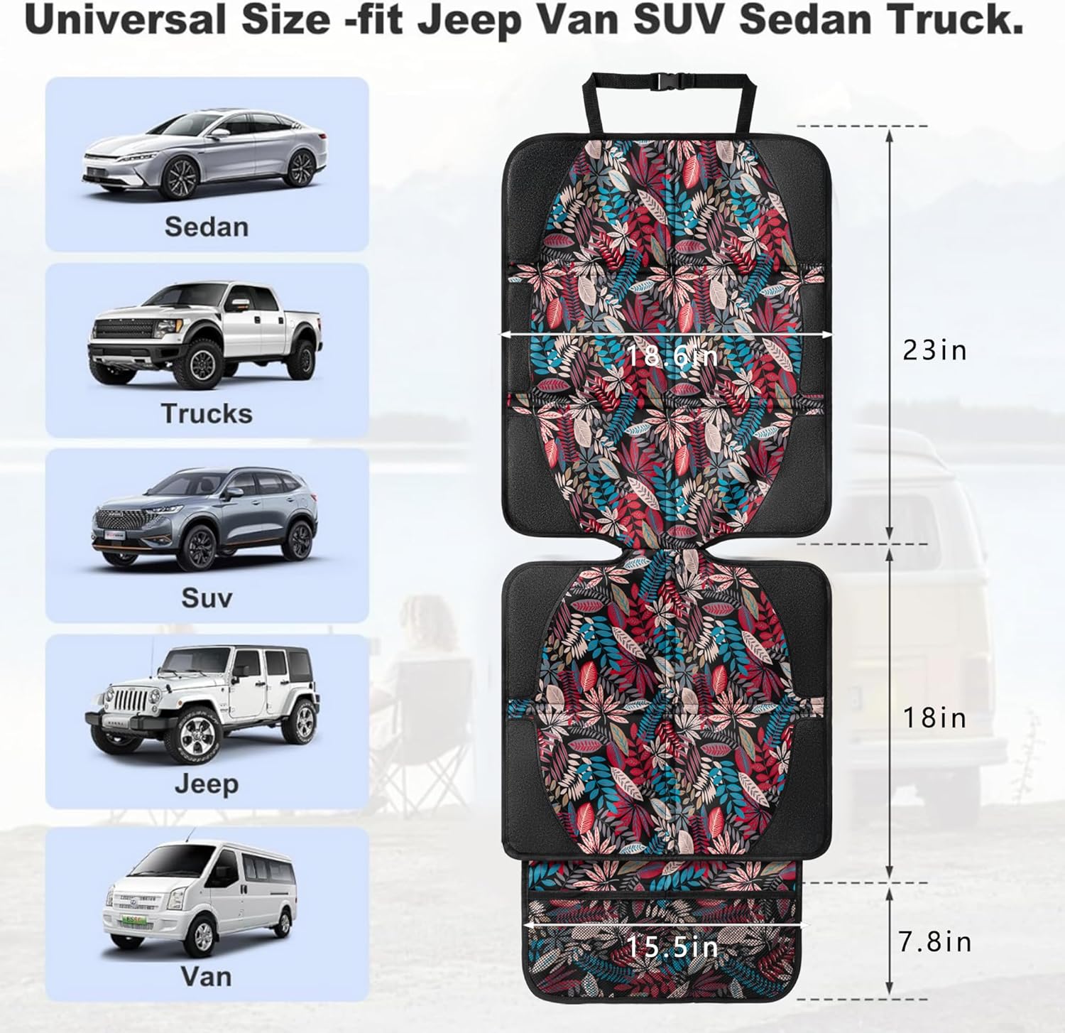 - The whole dimension of the auto seat protector carseat is 17.9 x 46.45 inch, the seat:17.9 x 16.9 inch, the back: 17.9 x 21.6 inch, and the mesh pocket: 12.9 x 6.8 inch. Universal fit Jeep Van SUV Truck.