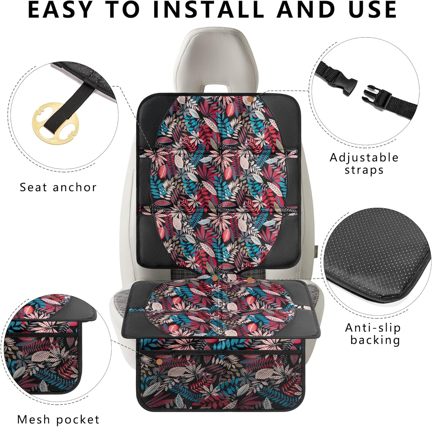 - Adjust the car seat protector top safaty straps and slip the flap into the car seat cushions. Non-slip backing increase friction and and prevents sliding, allows the child car seat protector to fit securely on the car seat, easy to install and use.