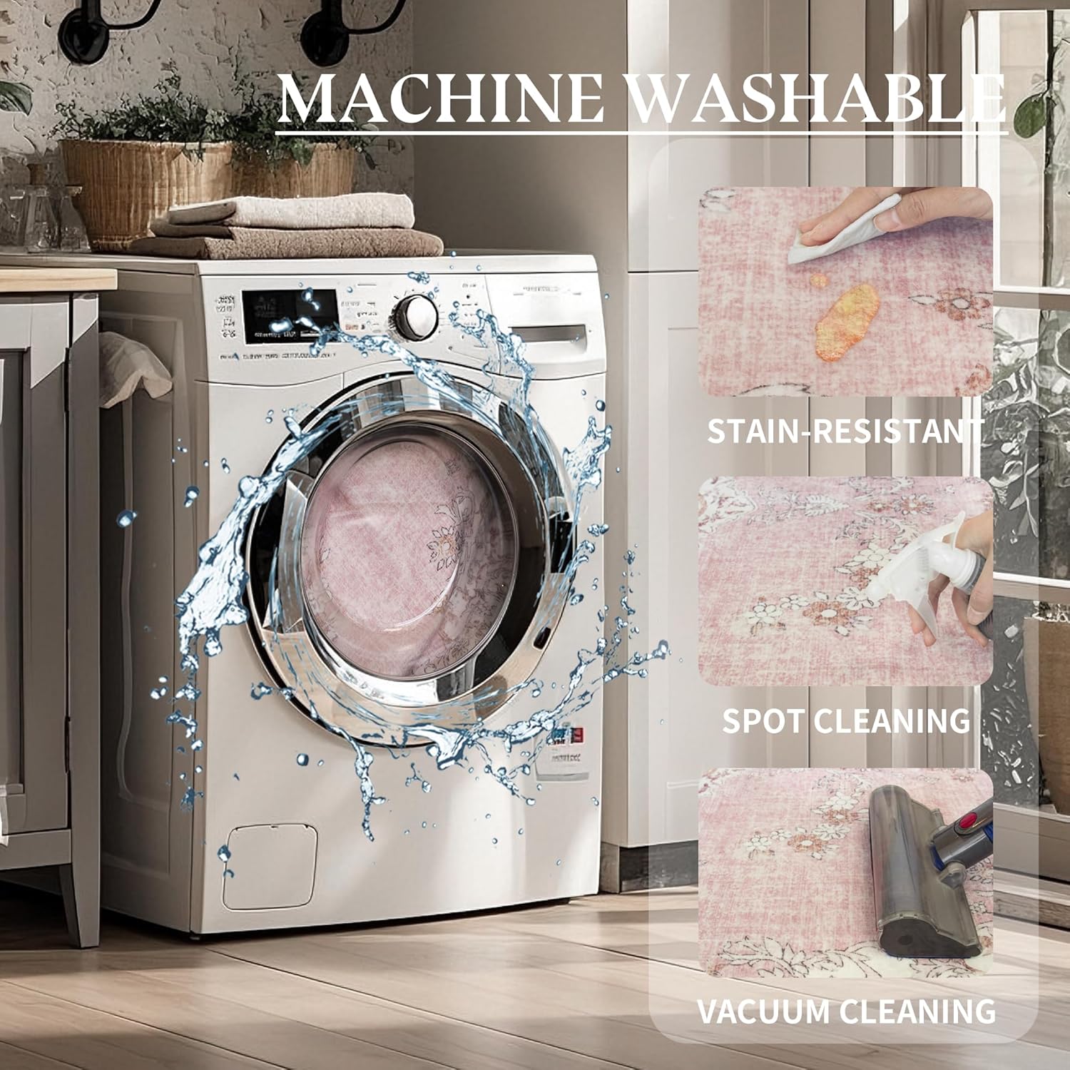 9x12 Area Rug Washable: Oriental Soft Area Rug for Living Room Bedroom No Shedding - Low Pile Thin Carpet Rug for Dining Room Non Slip - Boho Vintage Rug for Home Decor - Soft Pink