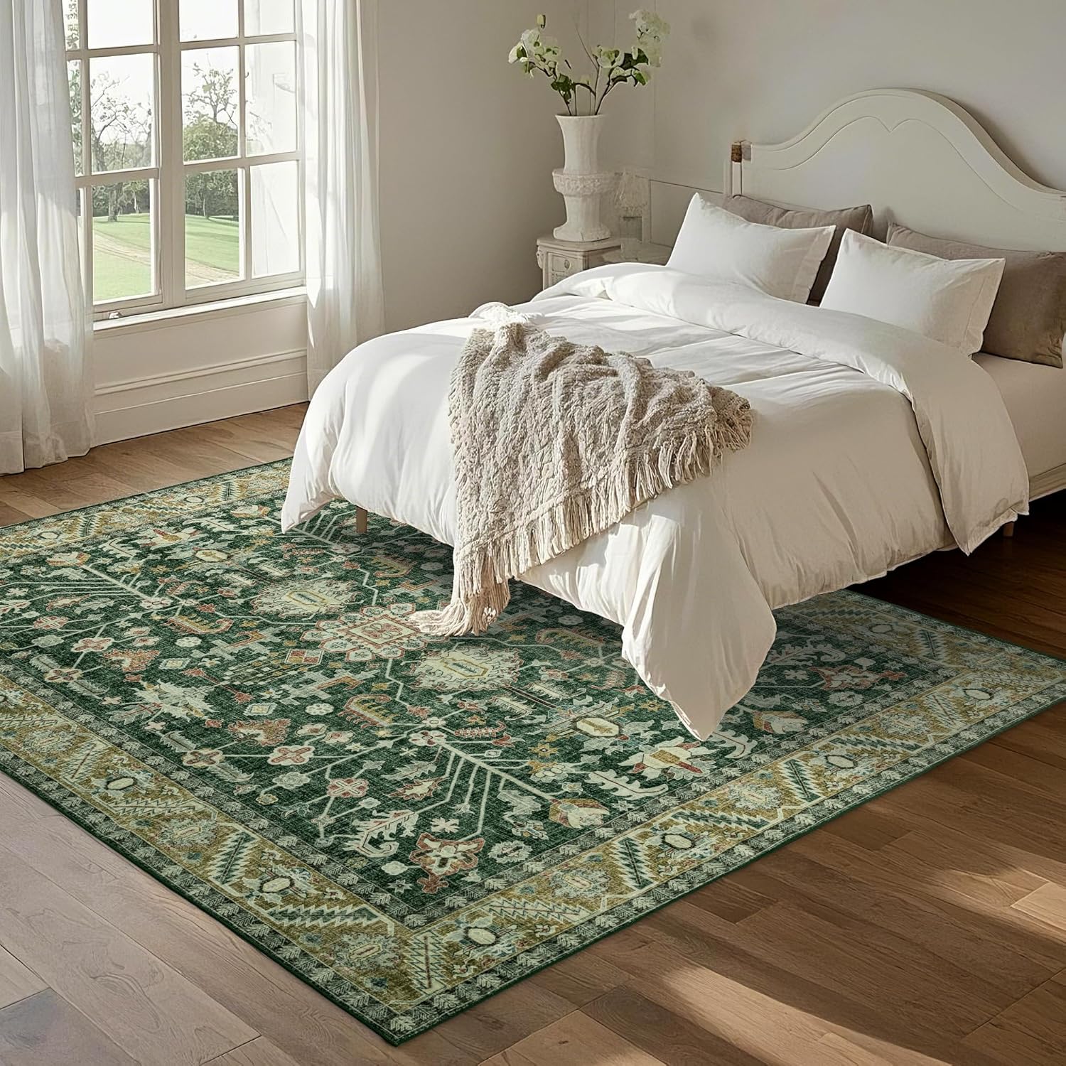 5x8 Area Rug Washable: Oriental Soft Area Rug for Living Room Bedroom No Shedding - Low Pile Thin Carpet Rug for Dining Room Non Slip - Boho Vintage Rug for Home Decor - Retro Forest Green