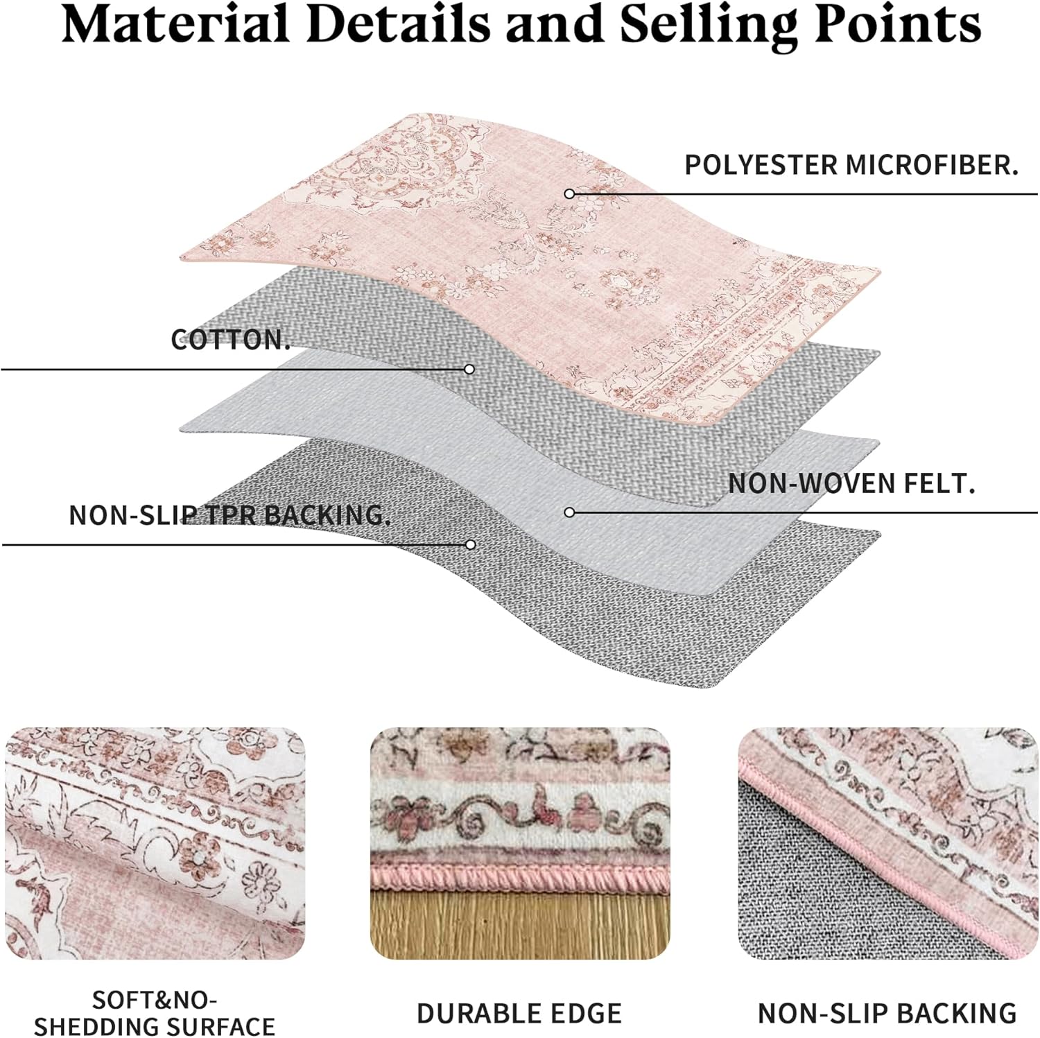 8x10 Area Rugs Washable: Oriental Soft Area Rug for Living Room Bedroom No Shedding - Low Pile Thin Carpet Rug for Dining Room Non Slip - Boho Vintage Rug for Home Decor - Soft Pink