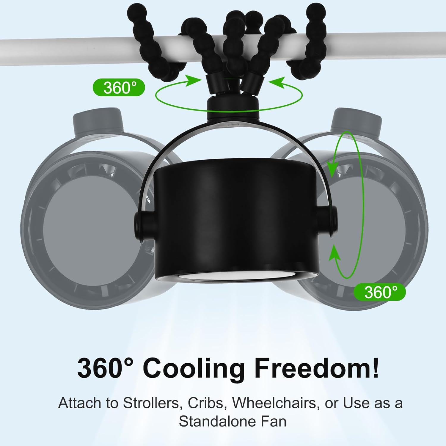 - 360° Rotation & Versatile Tripod Clip: Easily adjust the airflow with 360° rotation and securely attach the fan to strollers, cribs, wheelchairs, or use it as a standalone fan with the sturdy tripod stand.