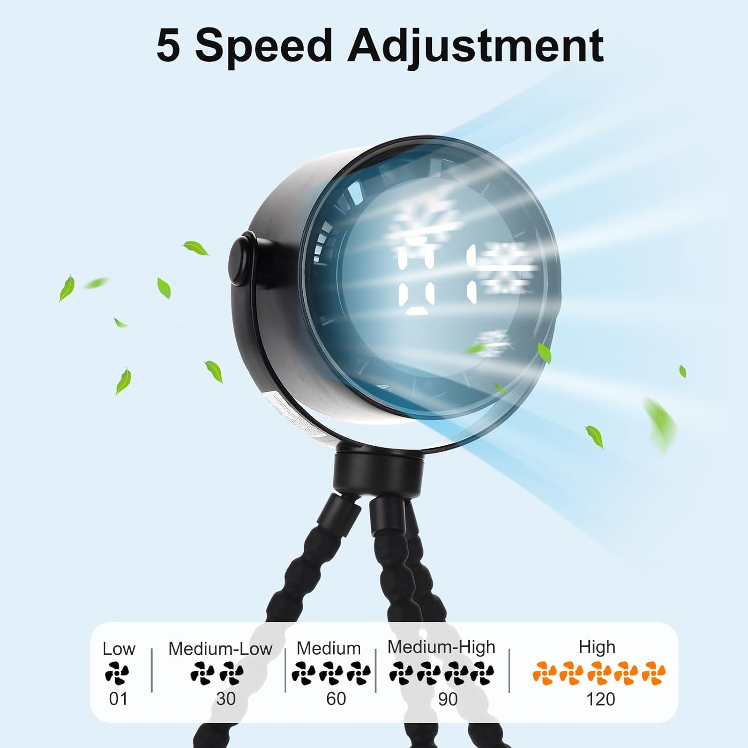 5000mAh Portable Stroller Fan with LCD Display, 5-Speed, Rechargeable Battery Operated, 360° Rotation, Tripod Clip, 17-Hour Battery Life for Carseat, Strollers, Cribs, Wheelchairs, Bedrooms & Travel