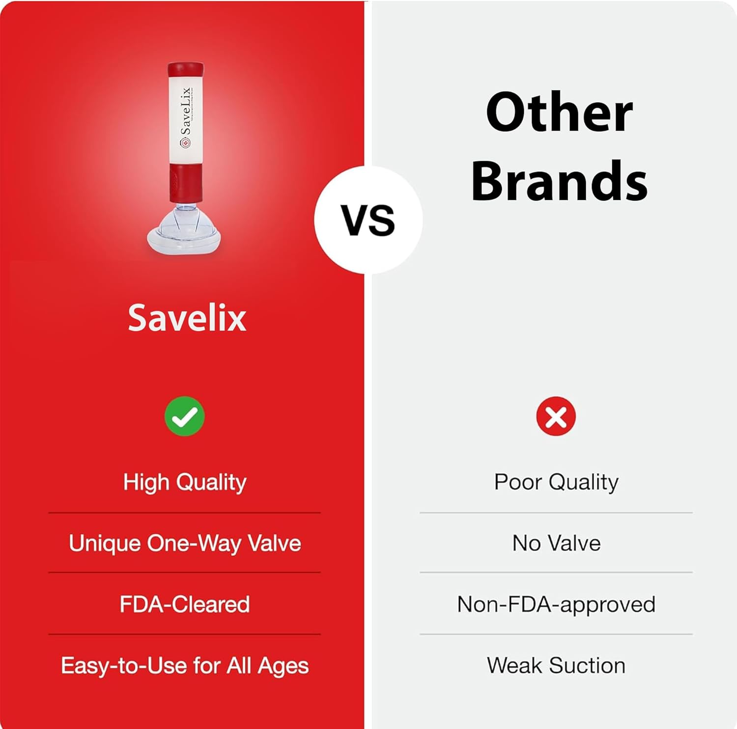 - FDA-CLEARED PEACE OF MIND: With SaveLix, you’ll have peace of mind knowing you’re prepared for a choking emergency; keep it at home, in your car, diaper bag, or workplace, so you’re always ready for the unexpected or make it a perfect gift for friends and family; the SaveLix device is FDA-cleared, meeting the highest standards for safety & effectiveness