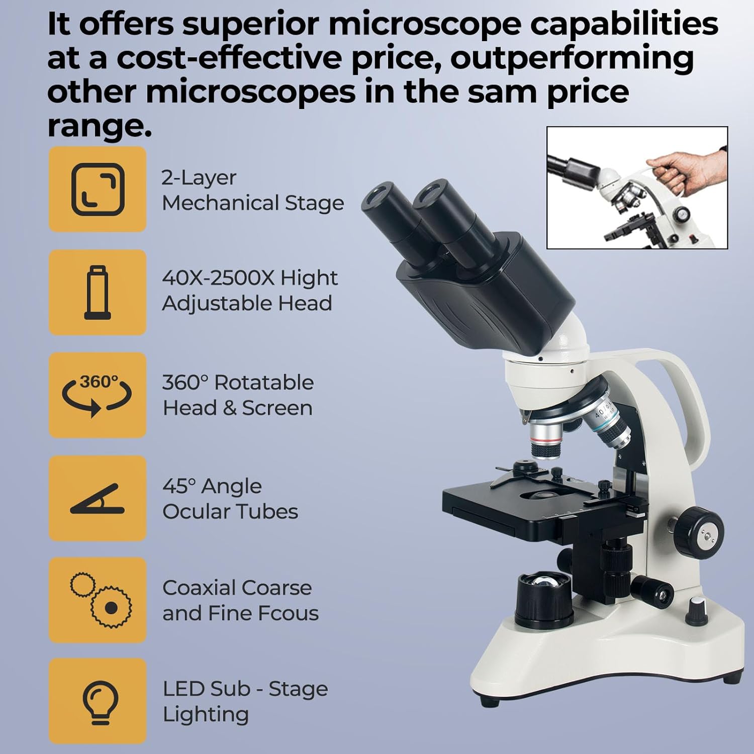 [Cost-Effective] Binocular Microscope, Vabiooth Lab Compound Binocular Microscope 40X-2500X Magnification with Two-Layer Mechanical Stage, Wide-Field 10X and 25X Eyepieces, Abbe Condenser, Metal Body