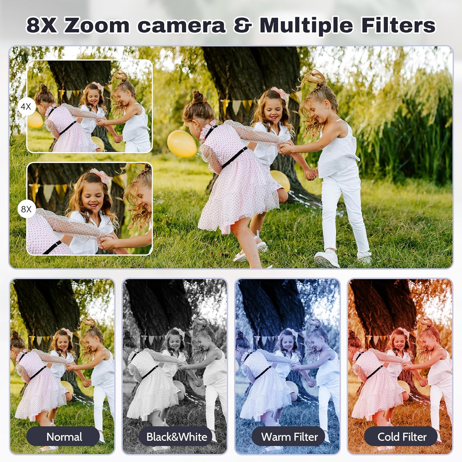 - 【Digital Camera with 8X Zoom & 2.4" Screen】 Capture clear details up close and enjoy vivid visuals on the 2.4-inch HD screen, perfect for kids and photography beginners to explore creative angles and framing