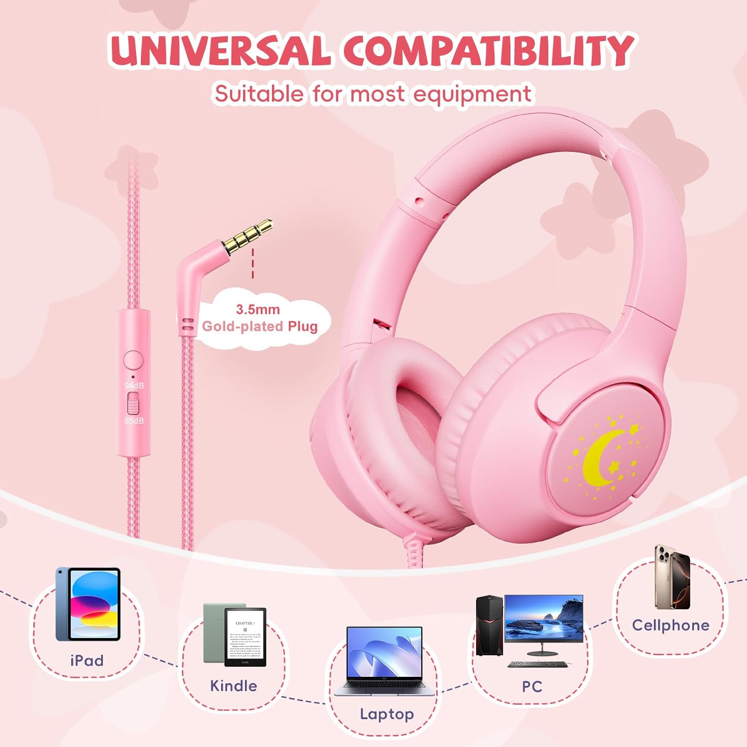 Kids Headphones with Microphone for School, 85/94 dB Volume Limit, Wired Over Ear Girls Headphones for Kids with Stereo Sound 3.5mm Wired Cord for Kindle Tablet Airplane Travel, Pink