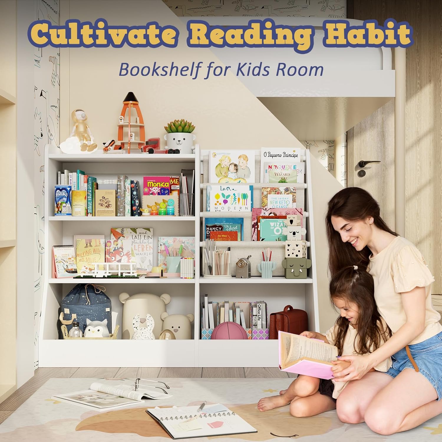 39" Large Kids Wooden Bookshelf and Toy Storage Organizer, Baby Bookcase with Sling Book Rack, Children Toddler Wooden Book Shelf for Kids Rooms, Playroom, Classroom, Nursery, School (White)