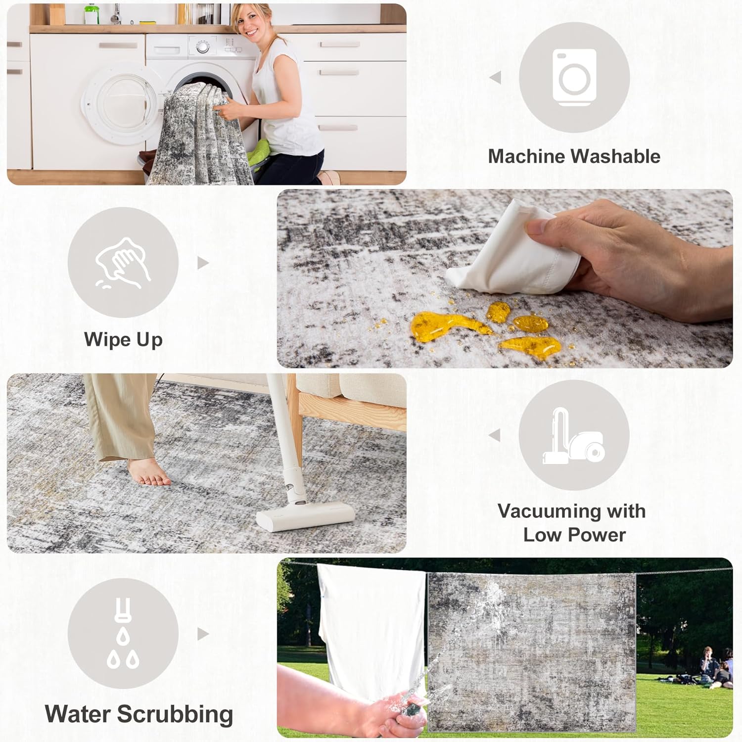 - Machine Washable Area Rug: Say goodbye to hidden dirt and cleaning hassles. The 0.2" low pile soft rug keeps most dirt on the surface, Easy to clean with a low-power vacuum cleaner.They are machine washable, and for sizes 6x9 and larger, we recommend using a commercial washing machine to restore their original beauty