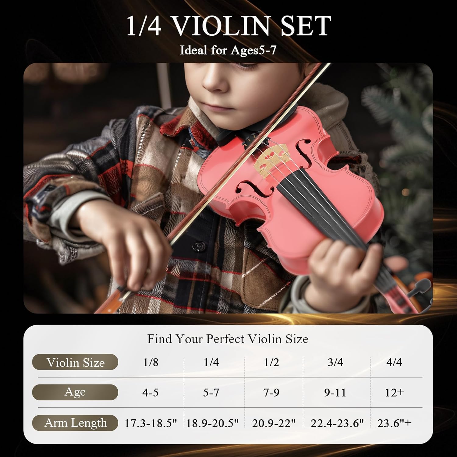 1/4 Beginner Violin Kit, Complete Violin Set with Case, Bow, Rosin, Pink