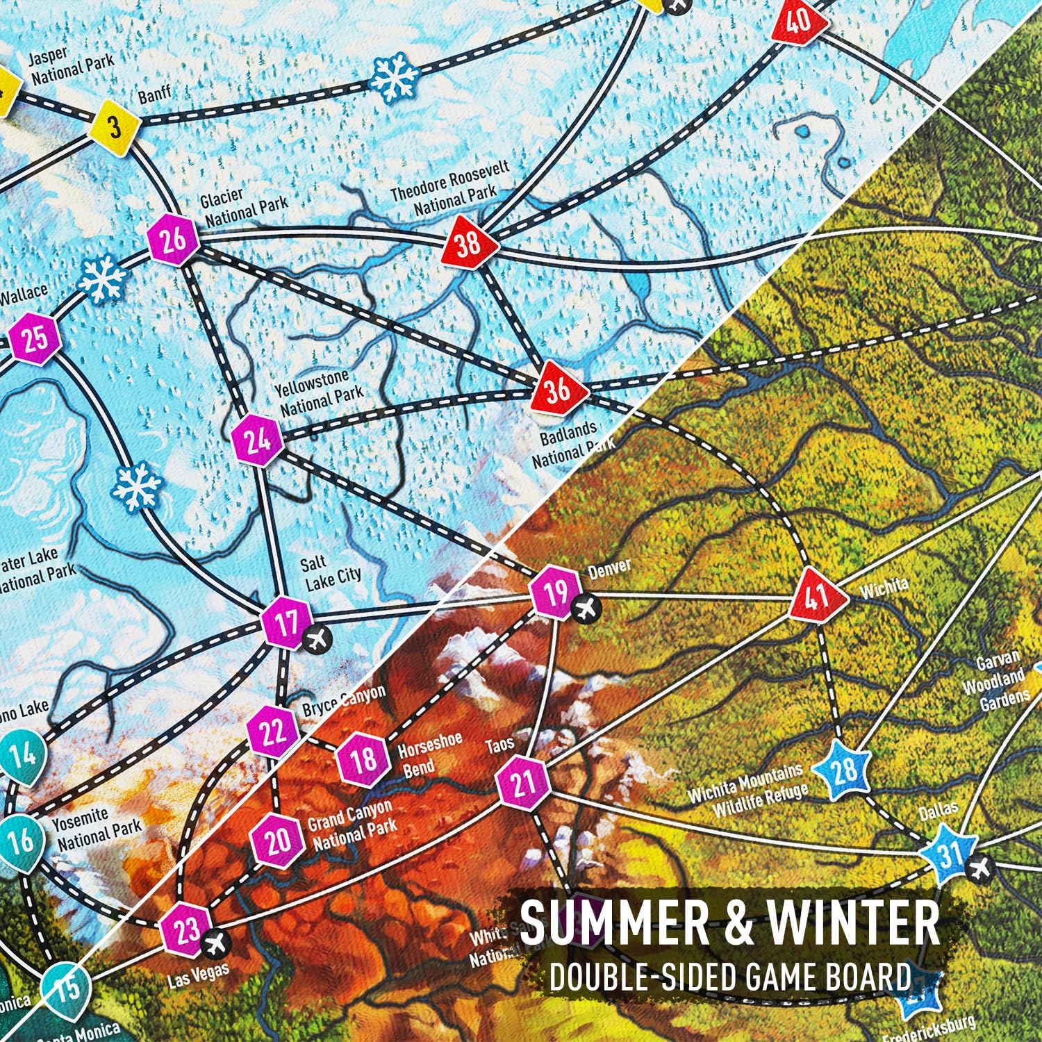 - REPLAYABLE VARIETY – With a double-sided game board (summer & winter), scenic landmark cards, and endless combos, this family travel board game stays fresh and engaging every time you play.