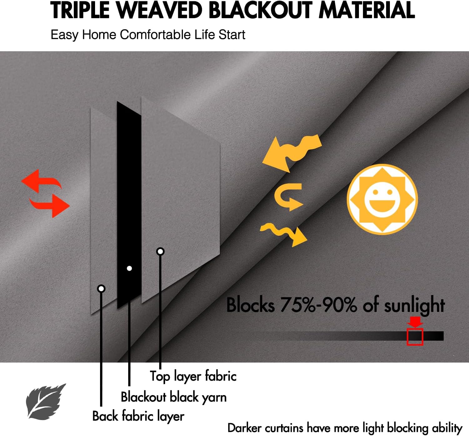 - ROOM DARKENING:These curtains are made with a triple weave technology that blocks 70-80% of light and UV rays (darker curtains work even better). Late sleepers and night shift workers can get better rest and cinephile can also enjoy a better movie-watching experience during the day meanwhile protecting privacy.