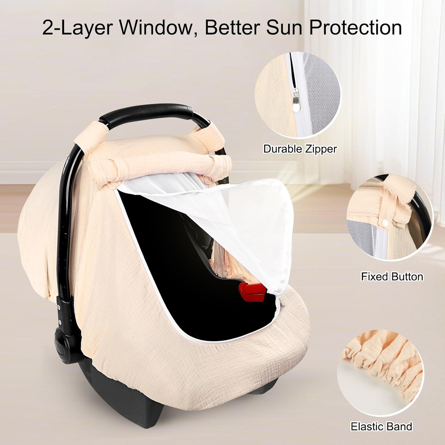 Hooyax Muslin Car Seat Cover Baby - Breathable and Privacy Car Seat Canopy with 3 Modes - Easy Install & Gift Box Packaging, Universal Fit for Infant Car Seats, Apricot