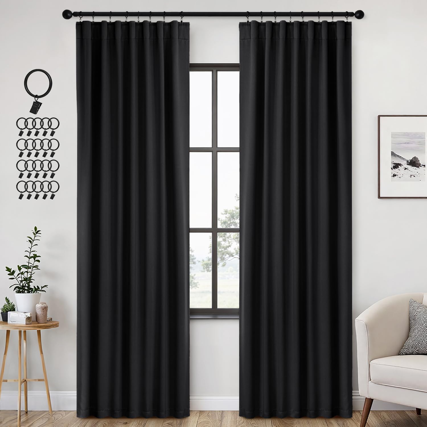 ANRODUO Back Tab Blackout Curtains for Bedroom Living Room, Rod Pocket Pinch Pleated Thermal Insulated Room Darkening Curtains 84 Inches Long 2 Panels, Black, 42 x 84 Inch