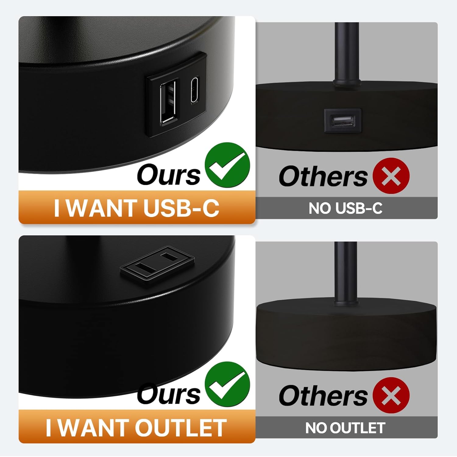 - ❤️【USB A+C charging Ports & AC Outlet】―Besides illumination, this modern table lamp for bedroom is euipped with USB A &USB C (5V/2.1A), and AC outlet (120V) for fast charging, getting your phones, tablets, humidifier, kindle, headsets, speaker and other electronics fully charged no matter if the side table lamp is on or off.