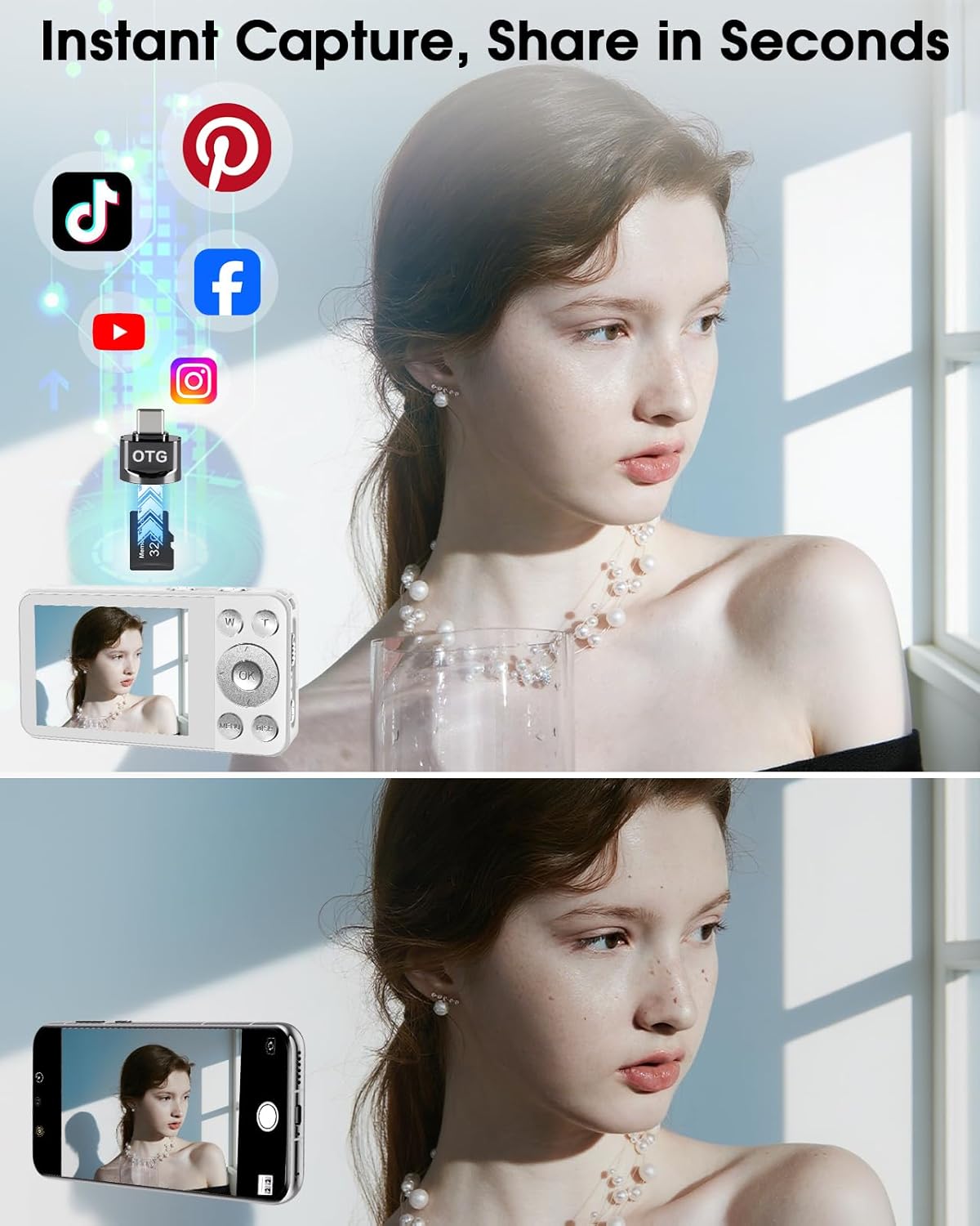 - Webcam Function & OTG Data Transmission: Use the USB cable to connect to your computer to transfer photos or use as a computer webcam, you can enjoy smooth video calls or live-stream your experiences with friends and family. Plus, this white digital camera equipped with OTG connector (Only Type C) to download or transfer photos or videos by simply inserting the SD card into it. PS: Data transfer and Webcam operation guidelines can be found on the QA page.