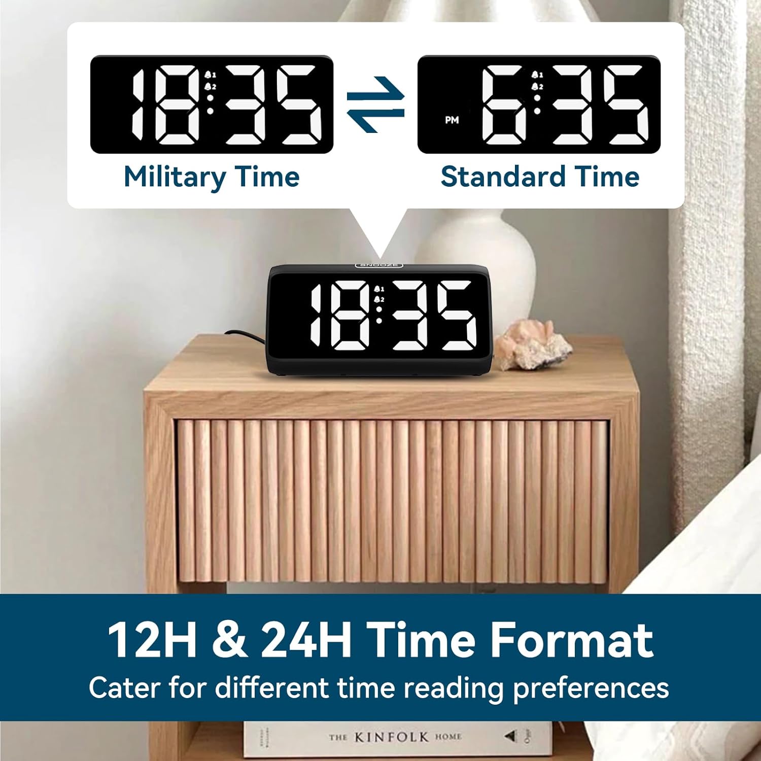 - BEDROOM CLOCK WITH DIMABLE LED DISPLAY: The compact digital clock (6.2" x 3" x 2.8") has a 48mm bold font for easy time viewing from a distance. You can easily toggle between 5 brightness levels, from very bright to completely dim. It also offers 12 or 24-hour time formats to meet different time reading habits.