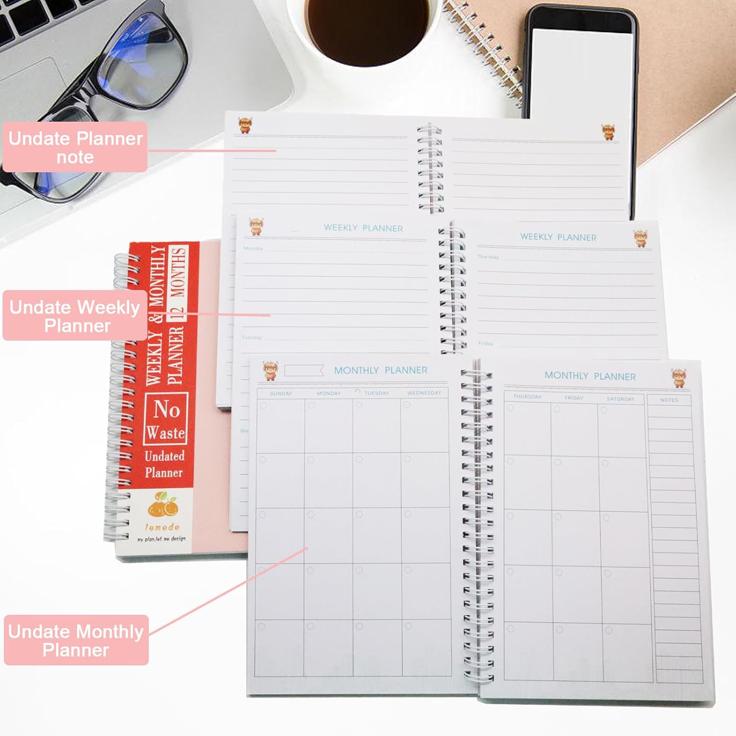 LEMEDE No Waste 12 Months Undated Planner Weekly and Monthly Planner, Weekly To Do List Notepad with Storage Pocket, A5 Undated Planners for Women & Men, Home Office Desk Accessories and Supplies