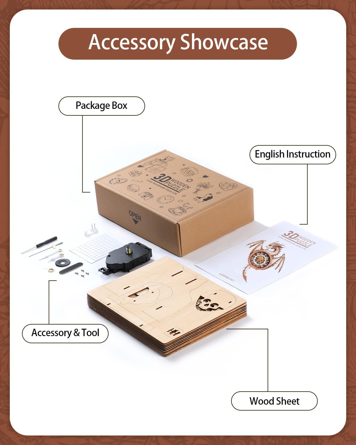 - 【Materials Eco-Friendly and Fine Workmanship】:3D puzzles for adults are made of eco-friendly linden wood, which is not fragile like thin paper. Each piece of adult 3d dragon clock puzzle is precisely laser cut with smooth edges. Vivid HD printing, rich colors, exquisite details (strictly inspected to ensure the number of puzzle pieces)