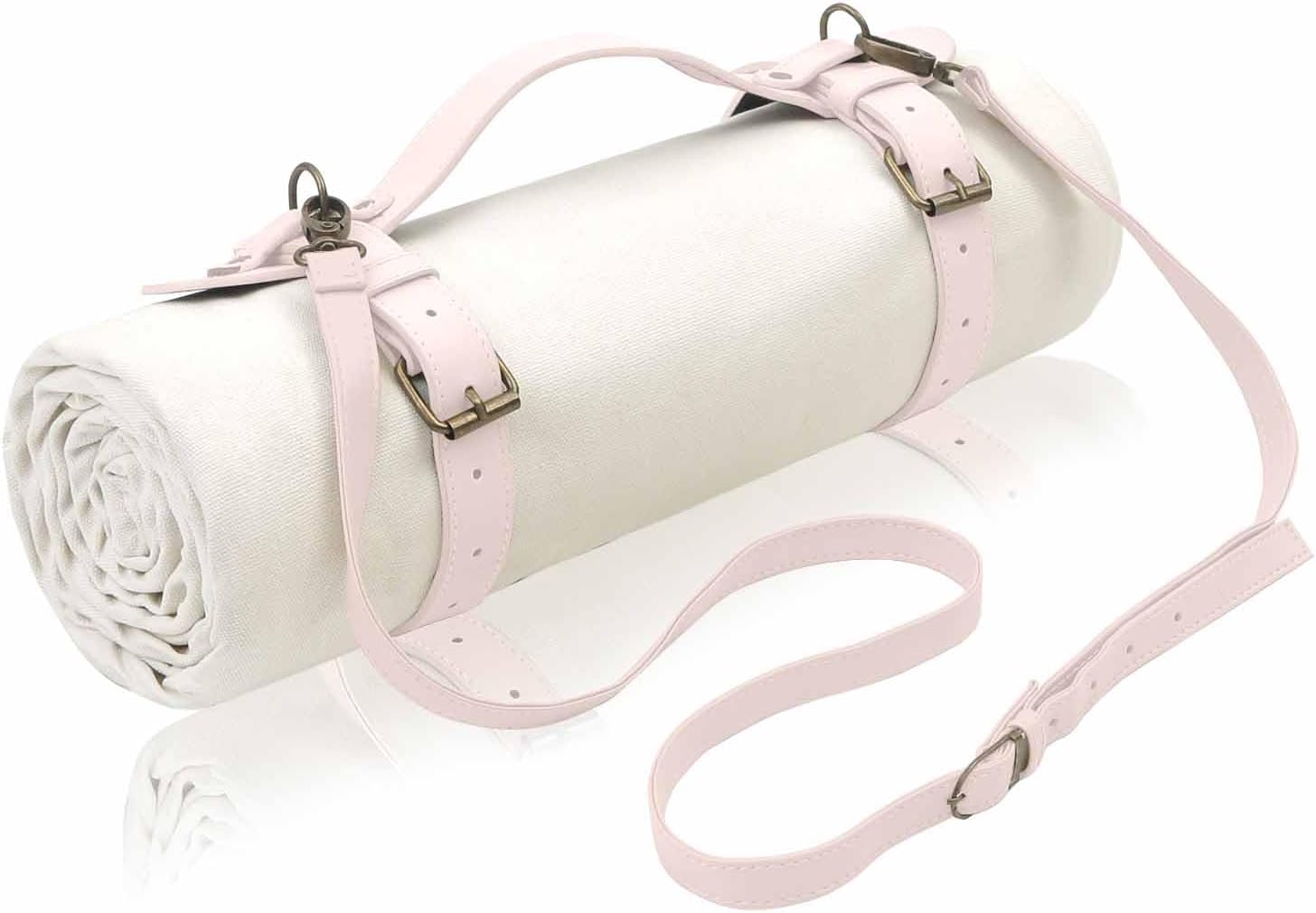 - Includes: 1 white canvas mat, faux leather handle/should strap, and webbing strap