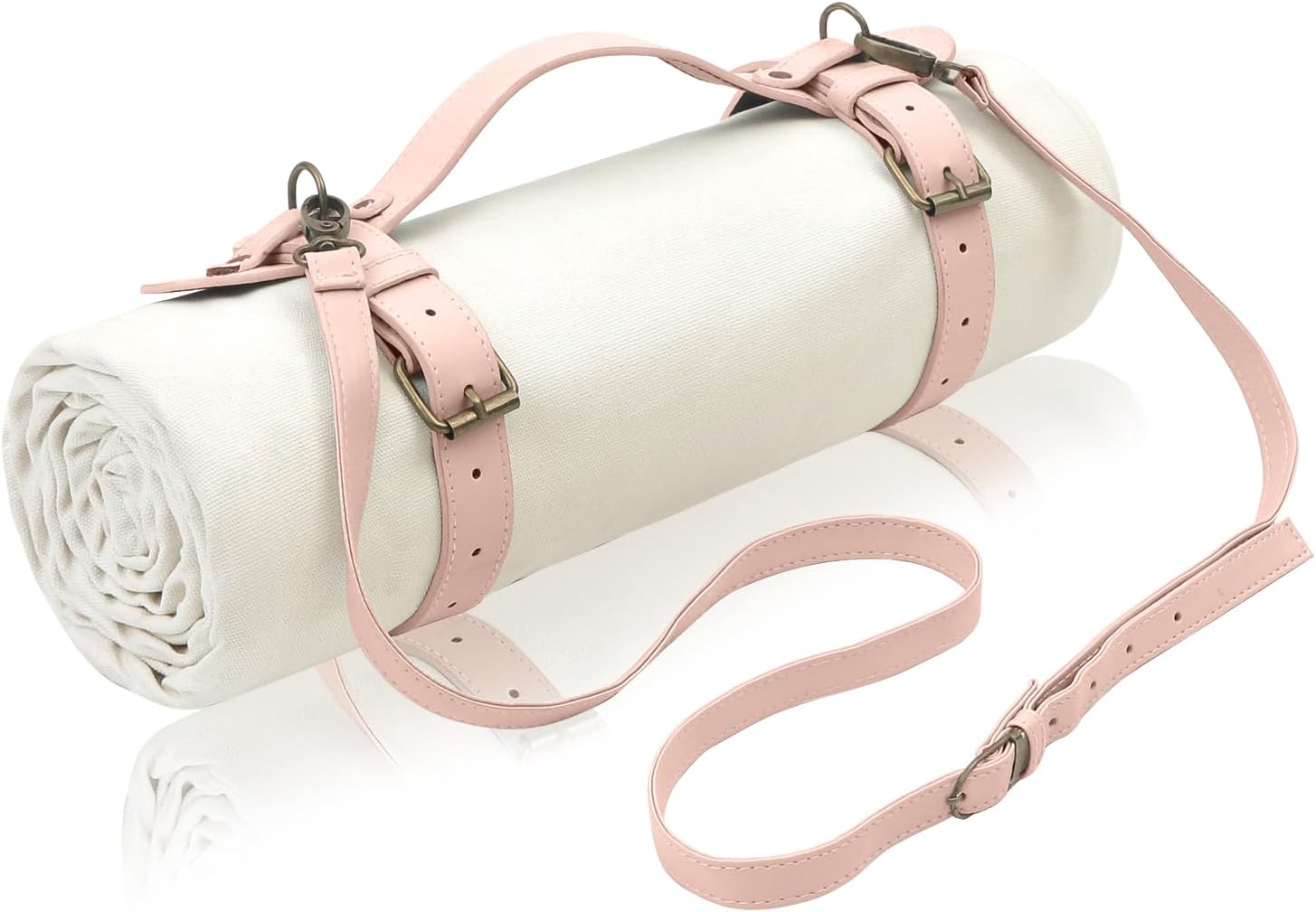 - Includes: 1 white canvas mat, faux leather handle/should strap, and webbing strap