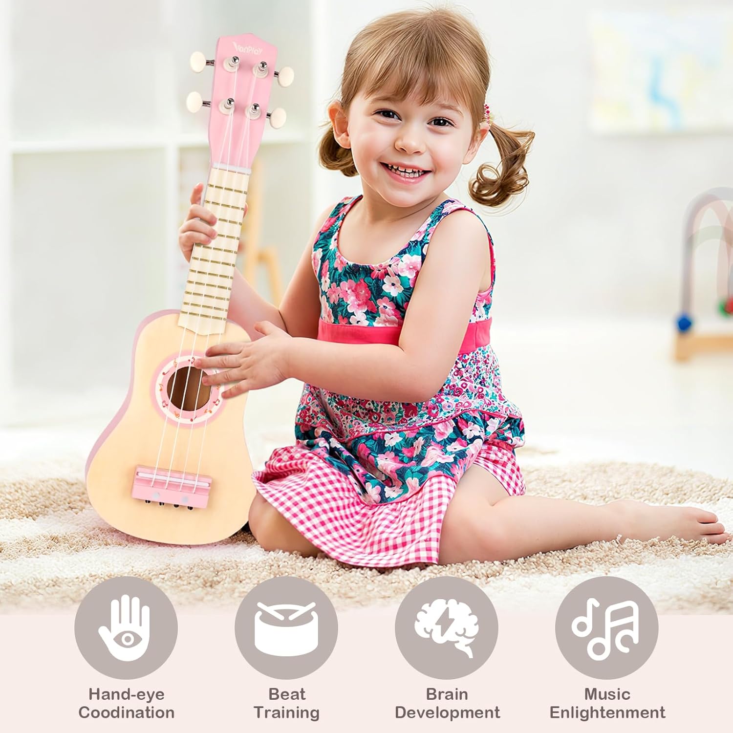 Kids Guitar Set for Girls - Toys for 2 3 4 Year Old Girl Birthday Gifts - 7 in 1 Wooden Montessori Musical Instruments with Ukulele/Tambourine/Maracas/Flute for Toddler 2-5(Pink)