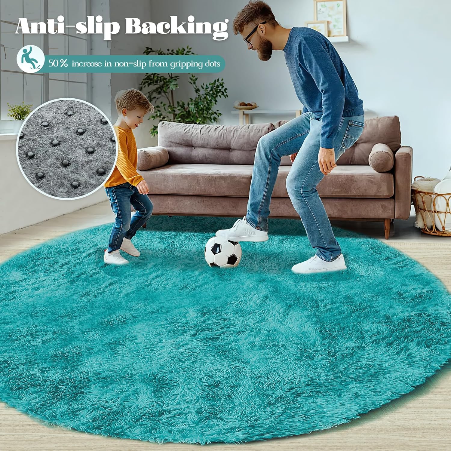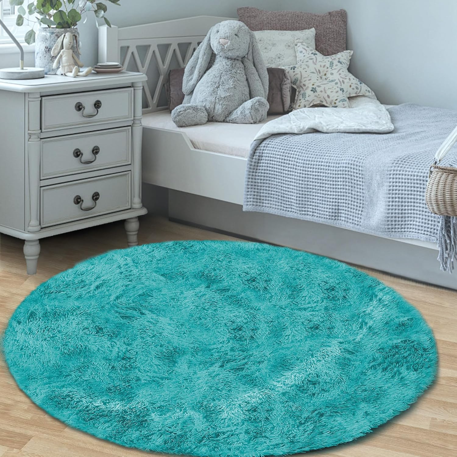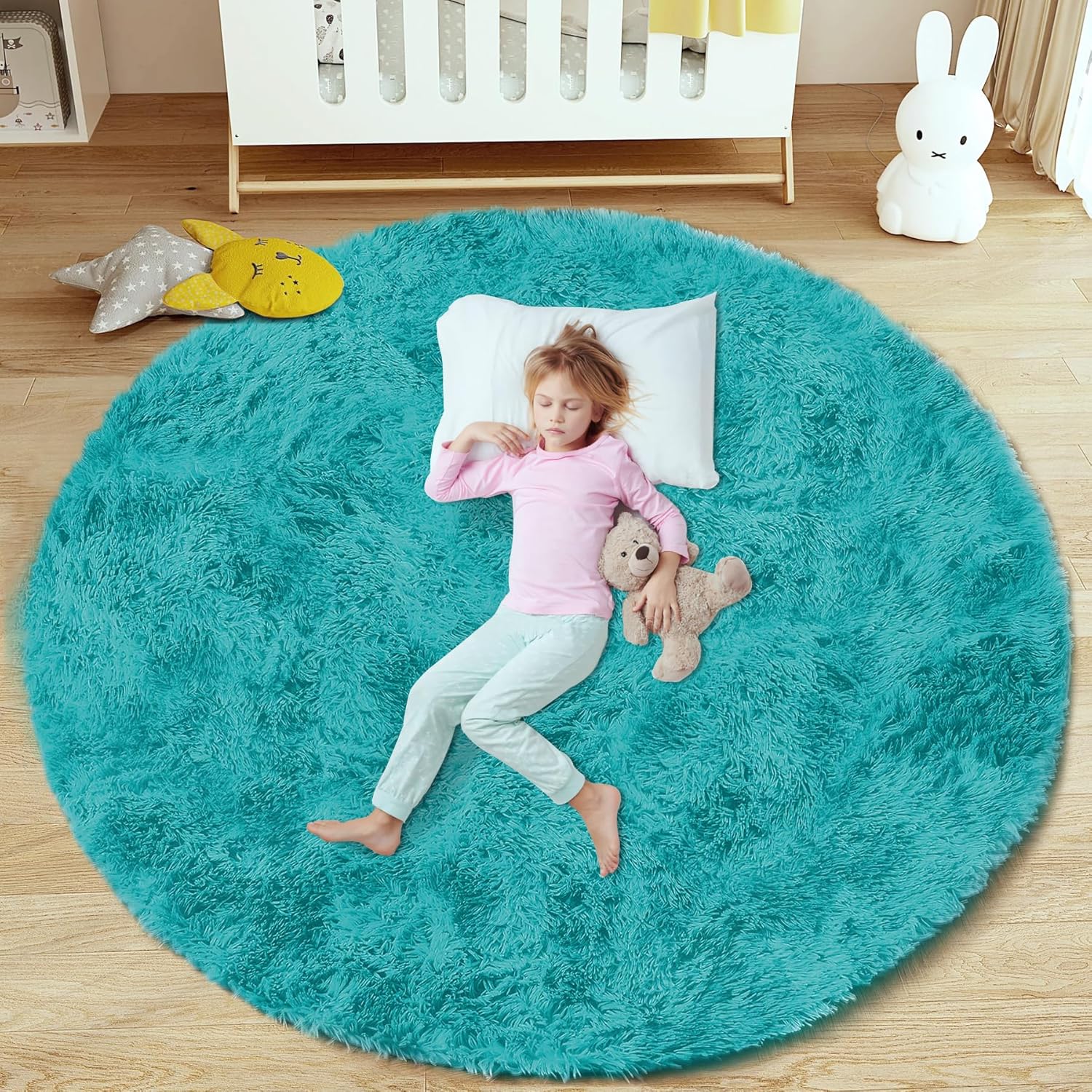 4FT Round Rug for Bedroom: Fluffy Shag Soft Washable Rugs Circle Small Fuzzy Plush Indoor Carpet for Living Room Nursery Playroom Dorm Kids Girls Boys Room (Teal Blue, 4'x4')