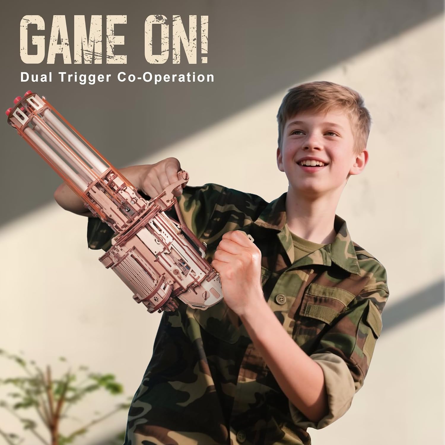 - Dual-Trigger Dominance: Experience authentic rotating-barrel machine gun operation with independent electric & mechanical triggers: Master the rotating barrel via electric trigger while controlling rubber band bursts with the press-fire trigger. Synced dragon flame light effects intensify rapid-fire immersion.