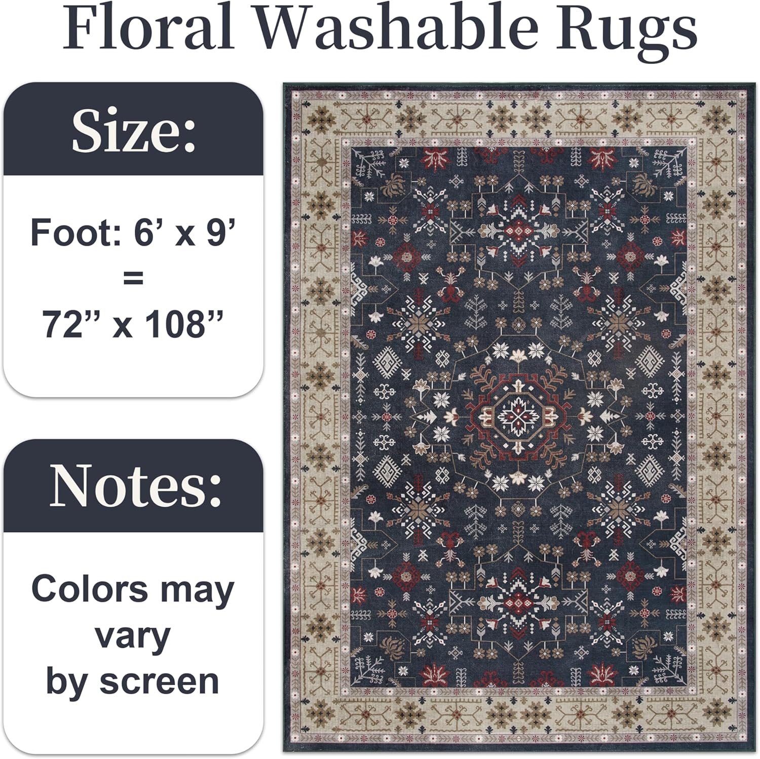 6x9 Washable Blue Area Rug for Living Room Bedroom, Boho Dining Room Rugs for Under Table, Large Low Pile Non-Slip Vintage Print Carpets for Farmhouse, Office, Dorm