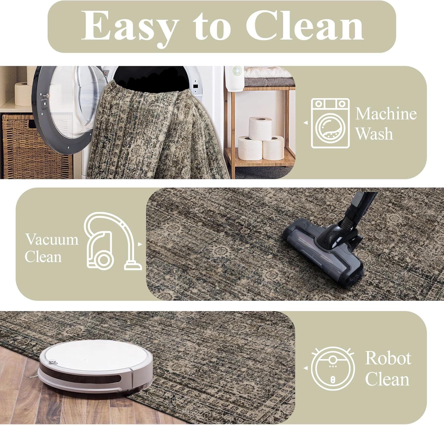 - Machine Washable The low-profile design of this washable rug makes maintenance effortless with any upright or robotic vacuum cleaner. As a completely machine-washable area rug, it offers the ultimate convenience for keeping your living room carpet or bedroom floor covering fresh. After washing, simply use a low-temperature iron to restore the carpet's smooth finish.