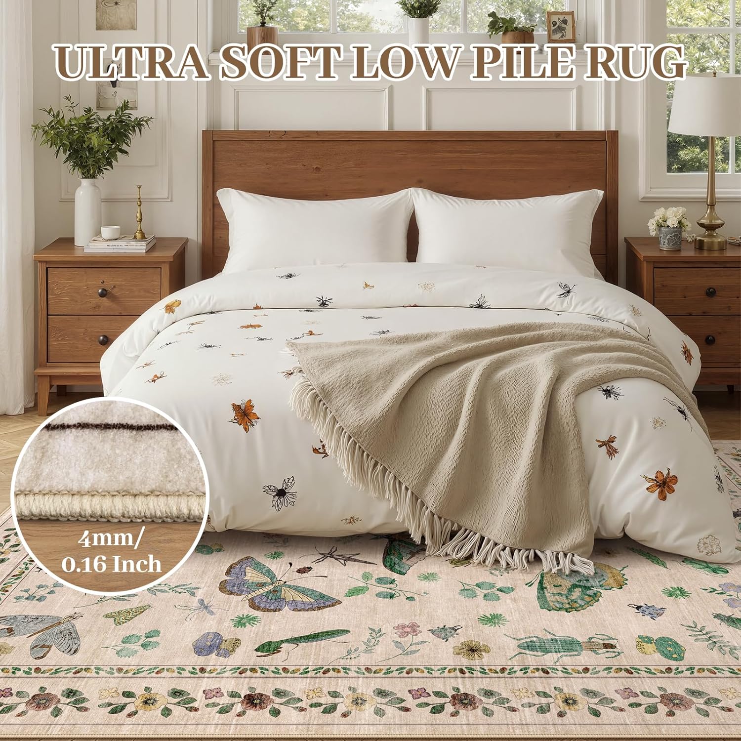 - Nature-Inspired Artistic Decor: Featuring intricate insect and botanical patterns, this 6x9 Rug adds unique natural charm to any room. Its slim profile easily slides under furniture, making it versatile for bedrooms, nurseries, or office