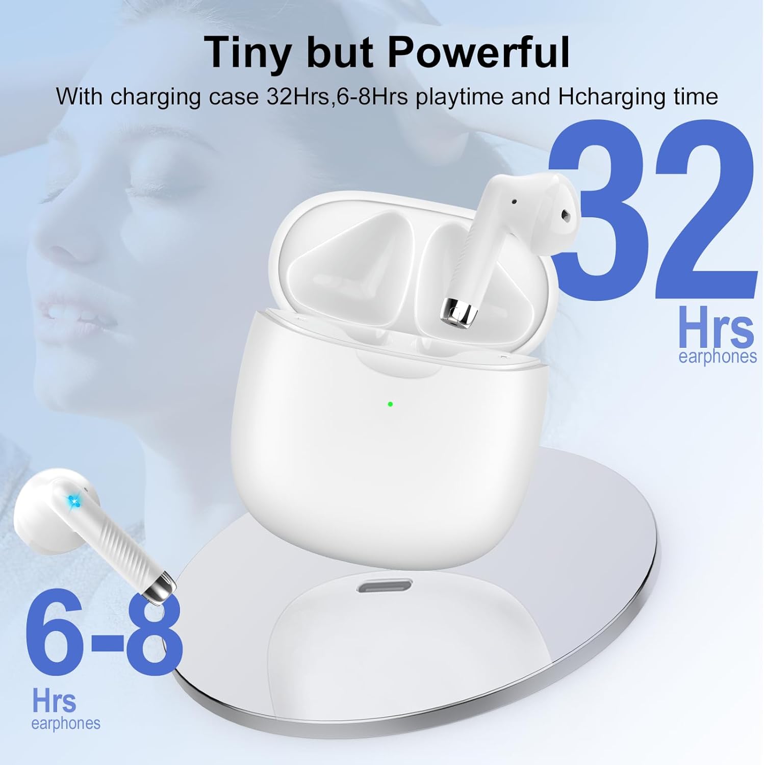 - IPX7 Waterproof and Smart Touch: Wireless earbuds for android with touch control, you can control music play/pause, previous/next track, volume+/-, answer/reject, end calls and enable voice assistance by tapping on earbuds. No need to ad32Hrs Total Battery, Non-Stop Entertainmentjust these on your phone. Waterproof earbuds are made of high-quality waterproof nano-coating, which can isolate sweat and rain, can work perfectly in different environments, enjoy high-quality music anytime, anywhere, ideal for outdoor sports and work.