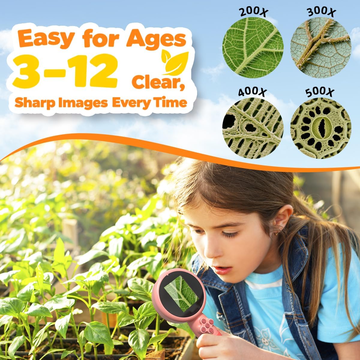 - 200X–500X Magnification with 1080P HD Clarity: High-resolution lens makes the microscopic world come alive. Kids can observe insects, plants, and everyday objects clearly, without blur or distortion, boosting their curiosity and learning.