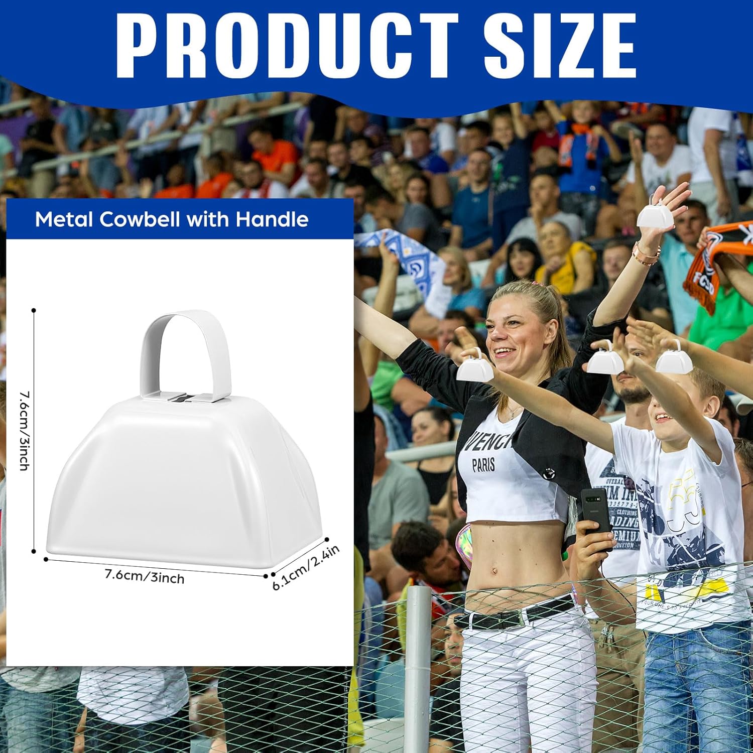 6 Pcs 3 Inch Metal Cowbells Noise Maker Hand Percussion Cow Bells with Handles for Sporting Events Cheering Noisemakers Weddings Team Spirit Sports Party Favors (White)
