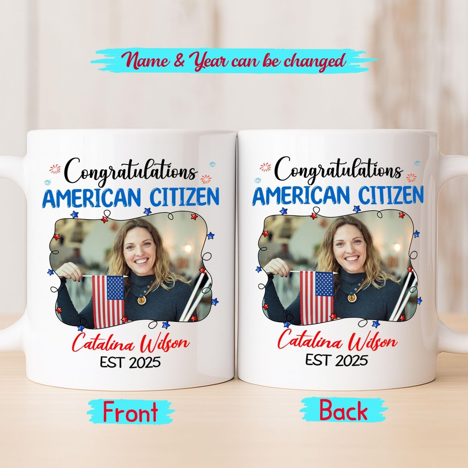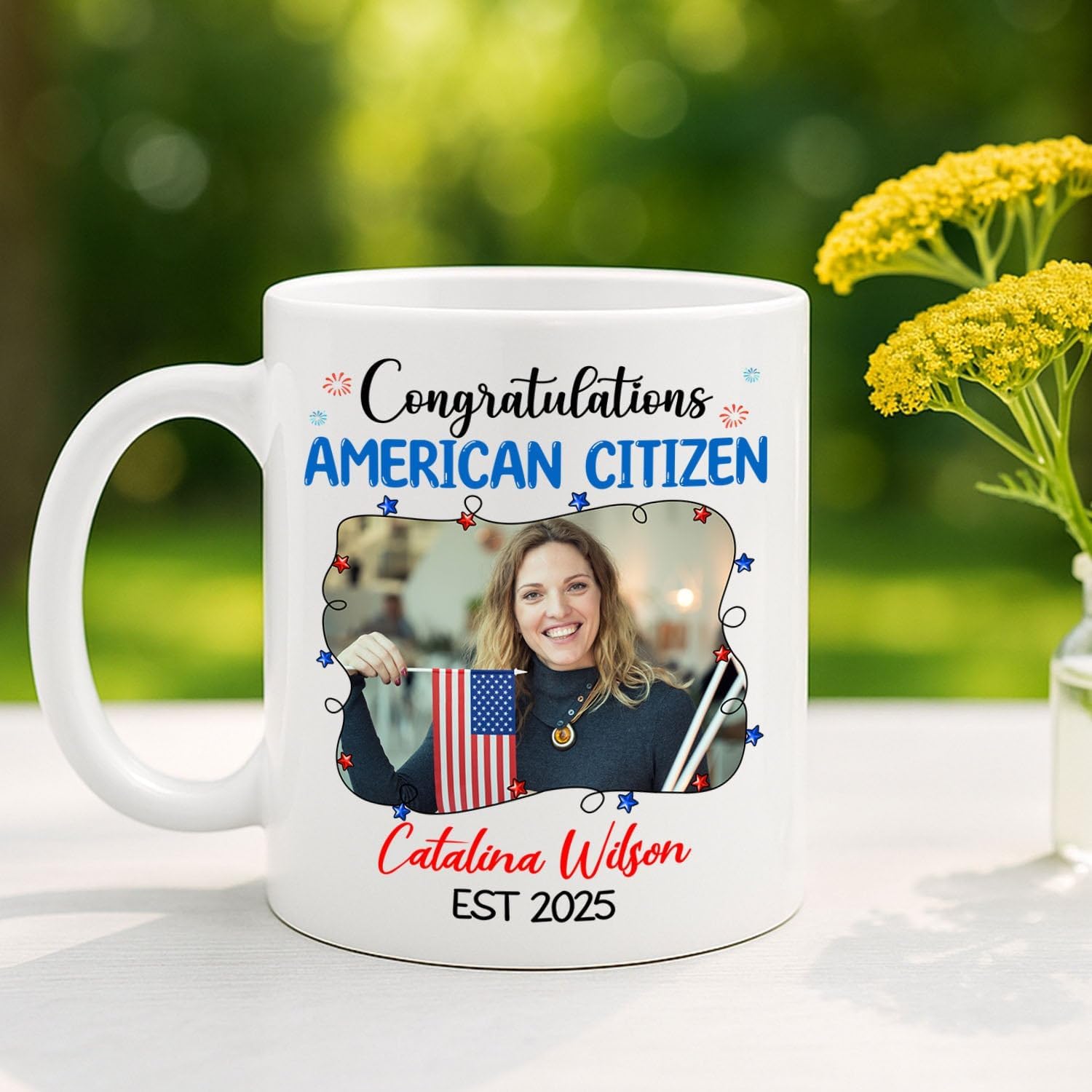 Congratulations American Citizen Coffee Mug, Customized Name Photo & Year On Citizenship Celebration White Cup Gift For Family Friend Coworker, Personalized Picture New US Citizen Ceramic Mug 11 15Oz