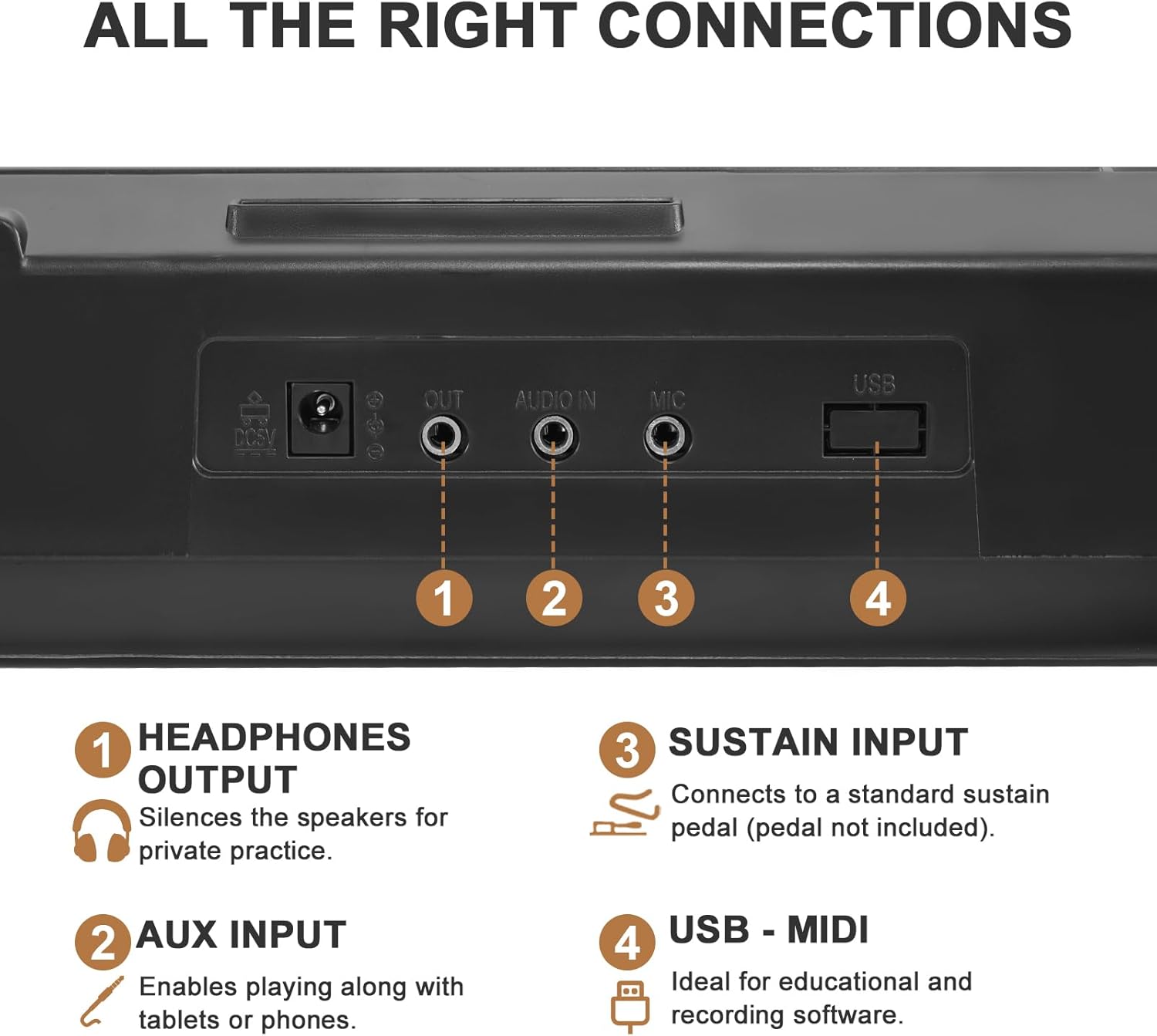 - Ultra-Portable & Flexible Power: Lightweight ABS body (<2.1kg) with battery operation (4×AA, not included) or adapter support enables music creation anywhere – ideal for travel, classrooms, or impromptu performances