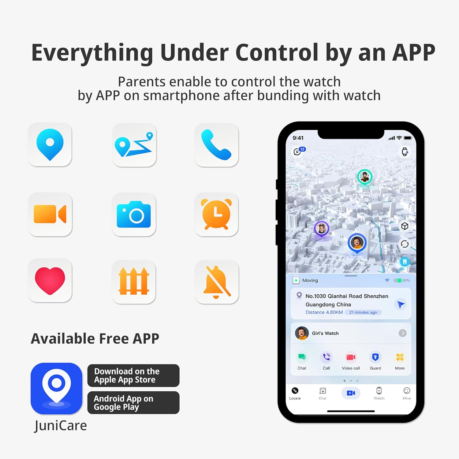 - ăMultifunctional Kids Smart Watchă- GPS watch for kids include real-time GPS location, phone call, video call, texting ,One-key SOS call, voice chat, camera, alarm clock, class mode, safety fence, pedometer, calculator, stopwatch, historical route, 5 puzzle games, Find Watch etc. You can also switch between 12 hour and 24-hour formats. Everything under control by an app, parents can complete all control of the watch through an app(JuniCare).